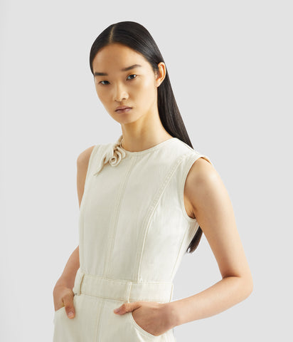Made from ecru denim, this pencil dress has a waistband with belt loops and pockets. It is decorated with three-dimensional tulips, a key motif in the Pre Spring 2026 collection.