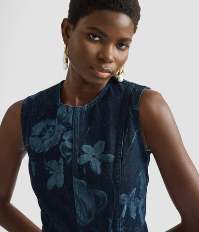 This fit-and-flare dress has a waistband with belt loops and pocketst. It is made from indigo denim which showcases a laser printing technique to incorporate the season’s Dutch masters-inspired florals.
