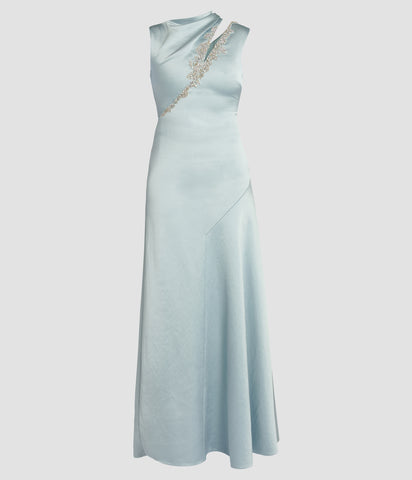 Cut from heavy satin, this cloud-blue gown is fitted at the bodice and gently flares to an A-line, floor-length skirt. Crystal embroidery draws attention to the cutout detailing.