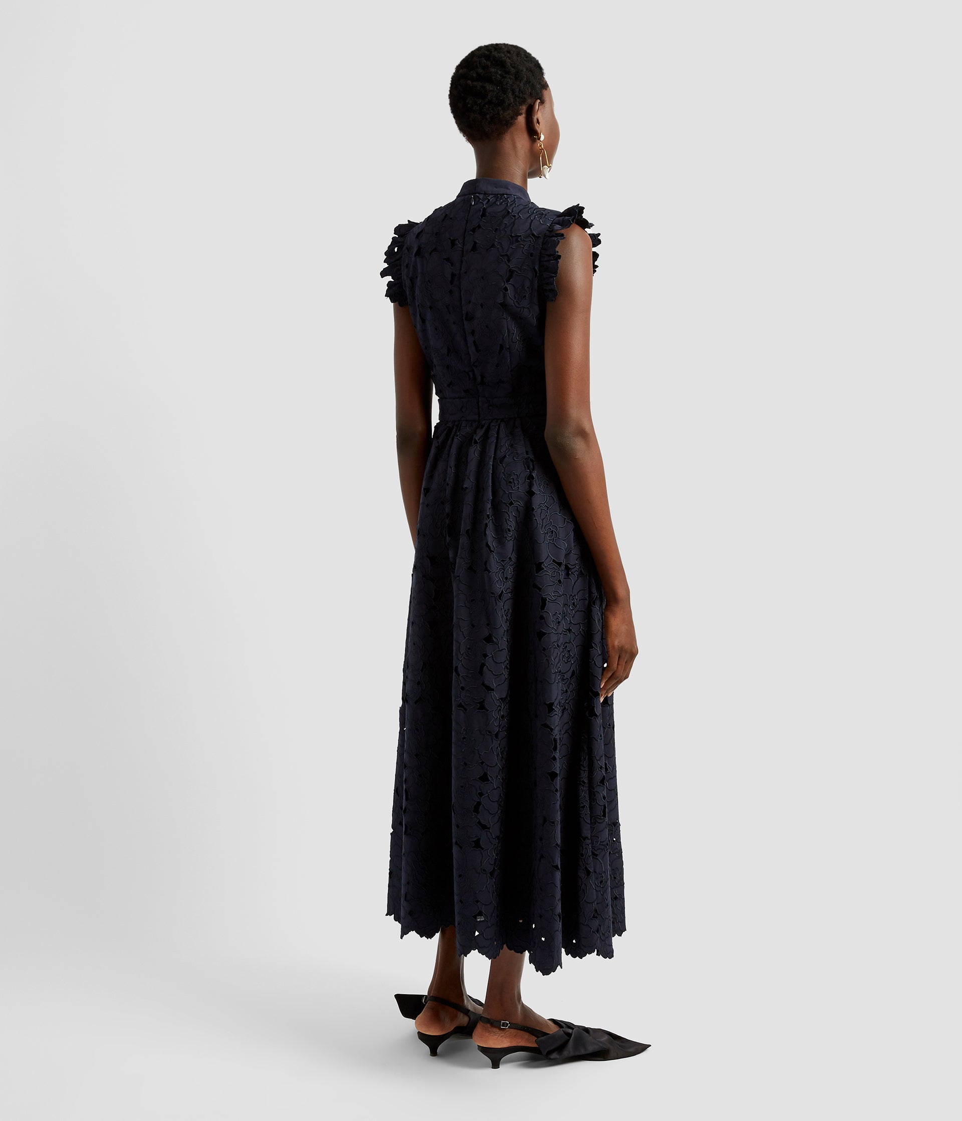 Imbue your eveningwear repertoire with romantic texture via this navy cotton floral cutwork dress. The feminine silhouette is defined by a stand collar, ruffled trims, and a full skirt. Keep accessories simple.