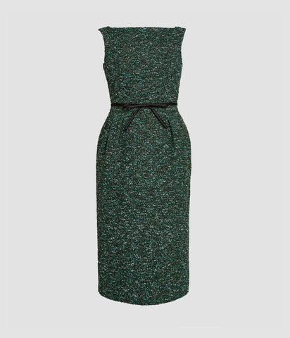 Made from hedgerow green tweed, this pencil dress is accented with a black bow at the waist.