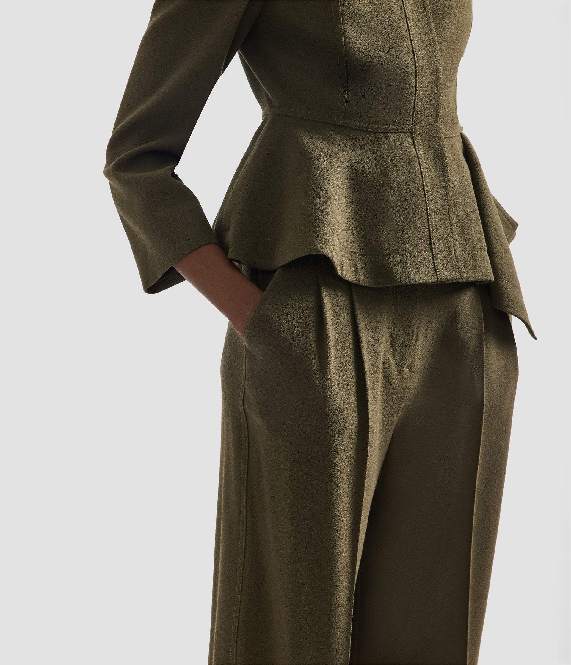 In military green, these straight-leg trousers are tailored from pure wool crepe. They have pleats at the front and pockets.