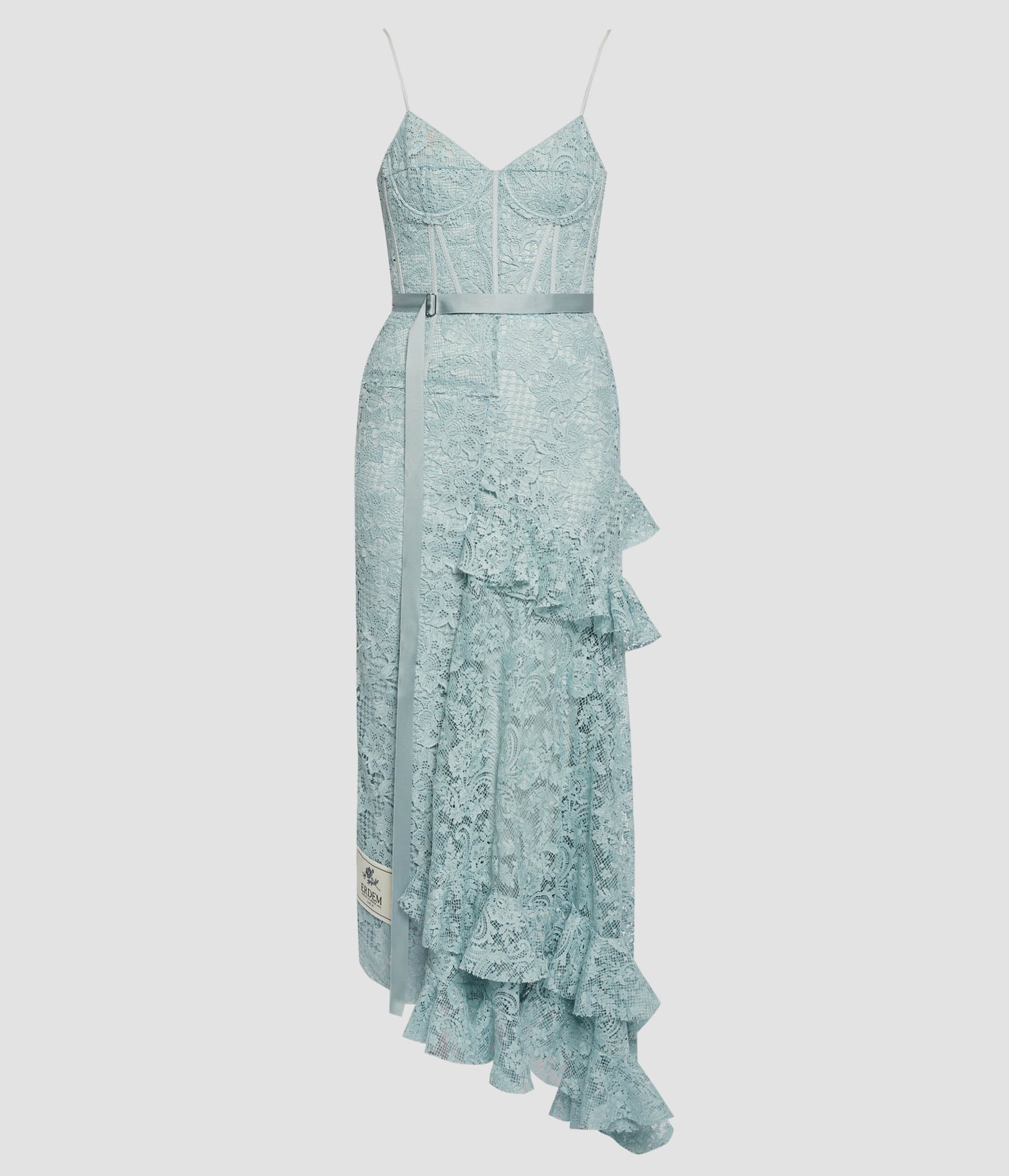 Part of ERDEM’s 20th anniversary capsule collection, this guipure lace dress captures the artistry associated with the house. It is cut for a fitted silhouette and falls to a ruffled, asymmetric hem. The sky-blue fabric showcases intricate floral motifs with a three-dimensional texture. A label at the hem marks the design as a piece from the capsule collection.