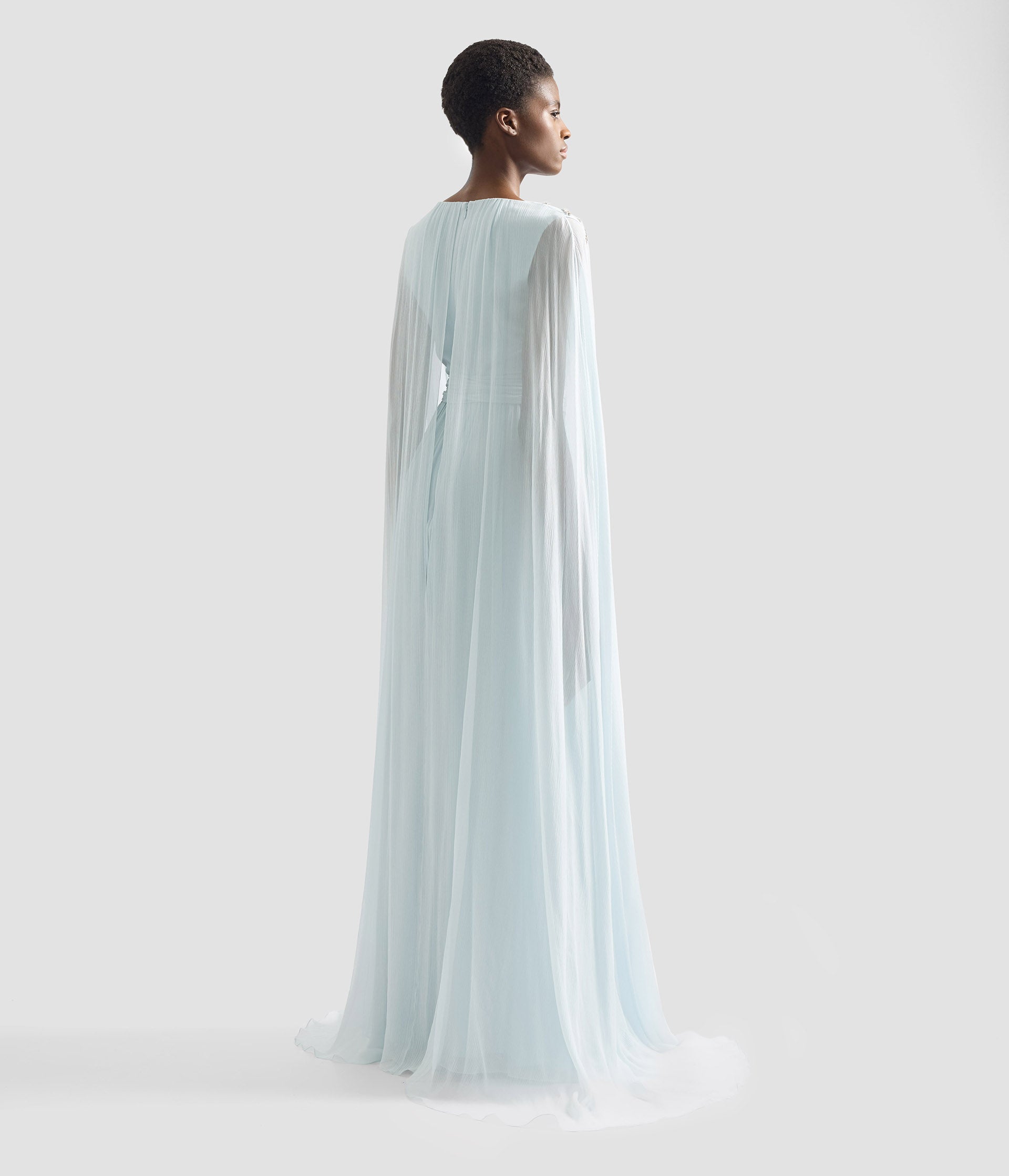 Cut from lightweight silk creponne, this porcelain blue gown is belted at the waist to create volume at the skirt. It is decorated with crystals at the shoulders and features flowing cape-style sleeves.