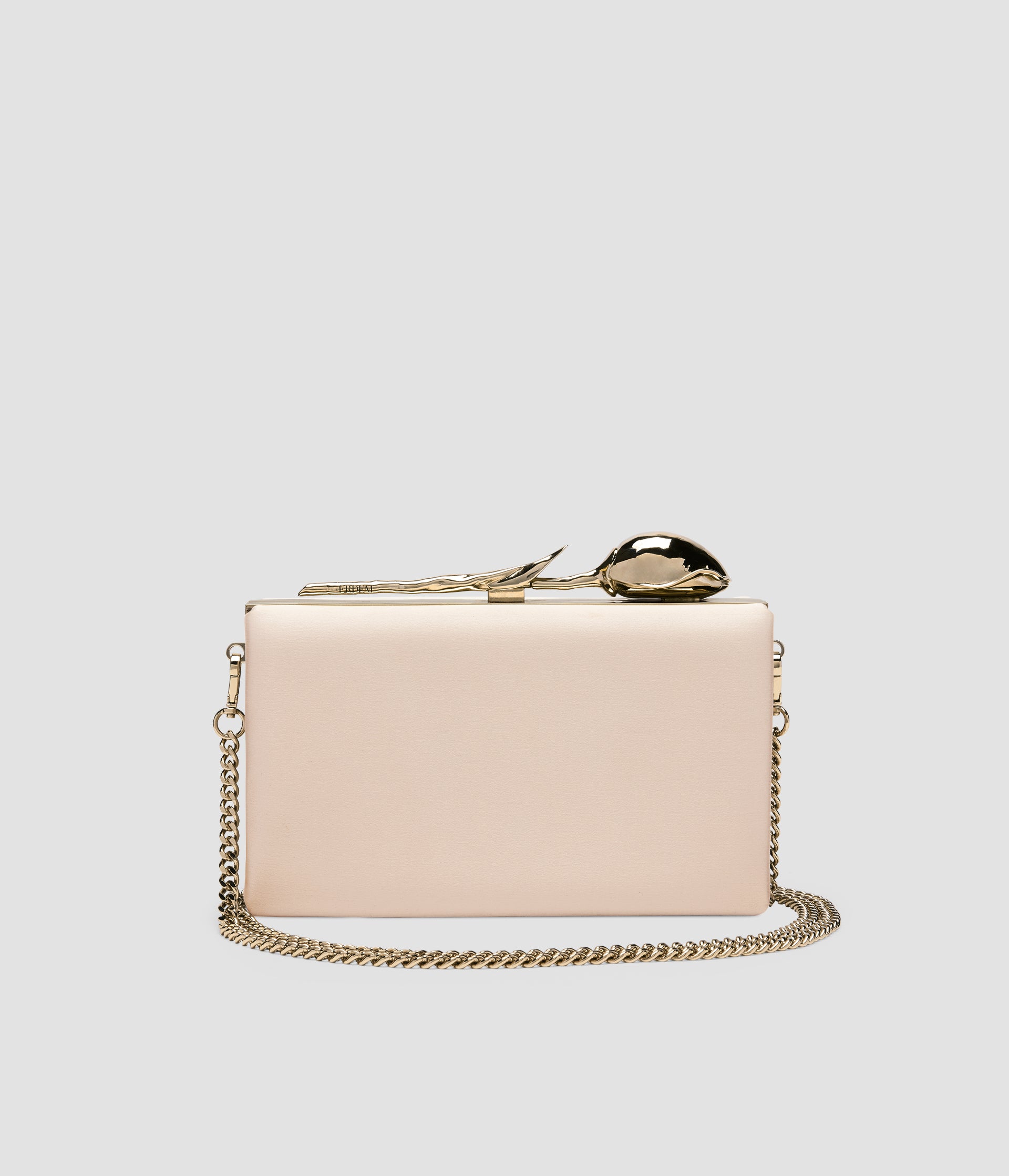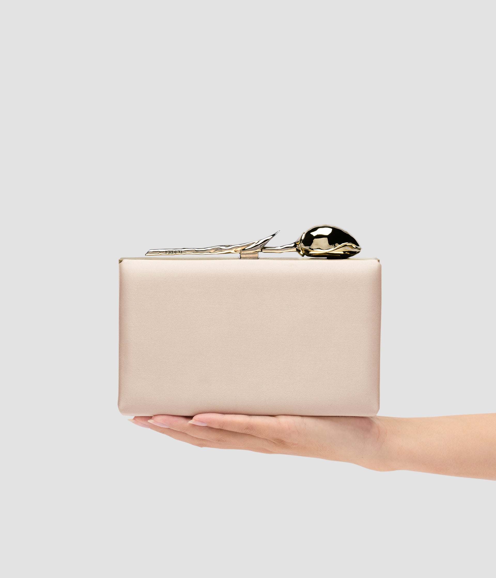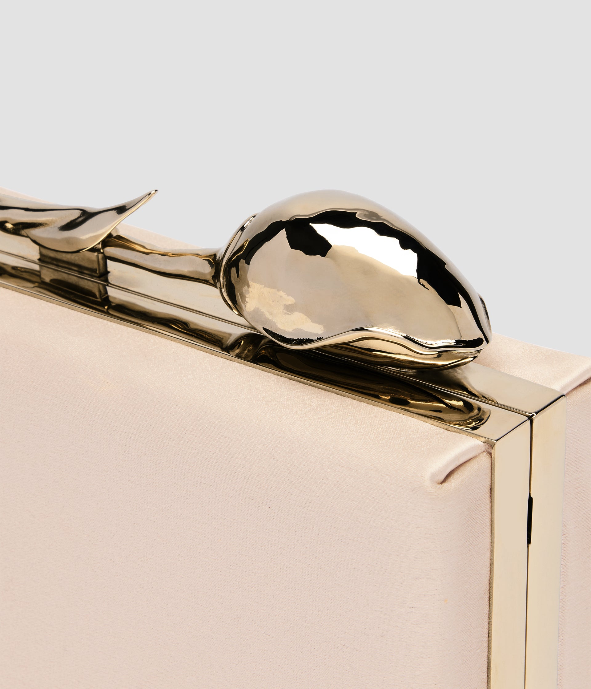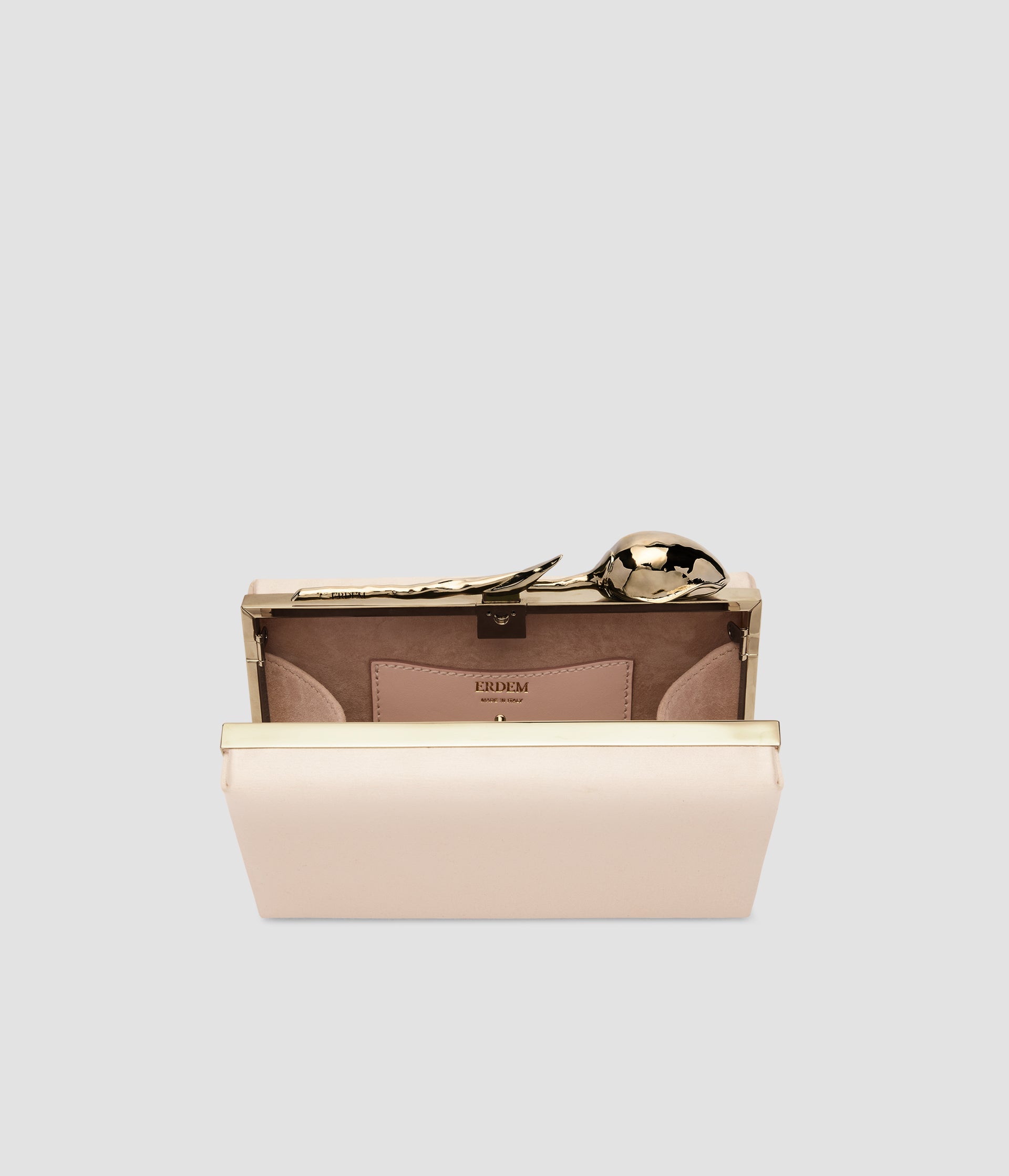 The Bloom Minaudière gold-toned flower bud floats elegantly along the top of the bespoke brass frame. It takes seven hours to produce using the lost wax casting method.