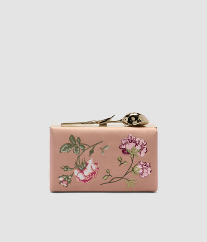 The Bloom Minaudière gold-toned flower bud floats elegantly along the top of the bespoke brass frame. It takes seven hours to produce using the lost wax casting method.
