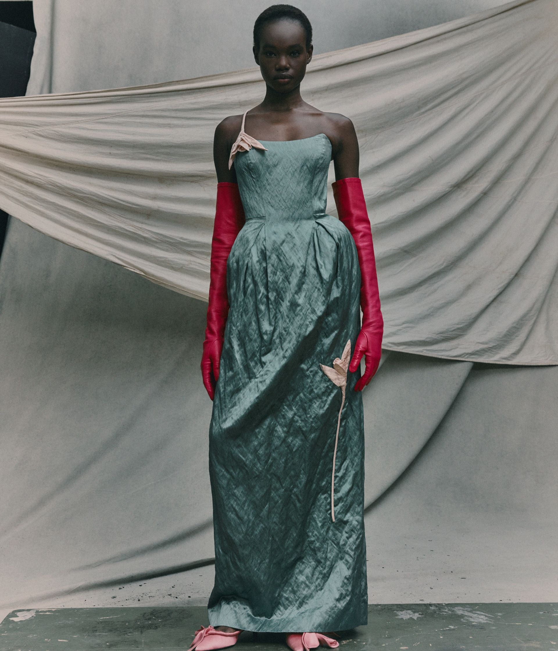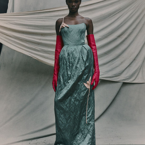 Crafted from eau de nil textured satin, this strapless gown has a structured bodice and long, column skirt. It is decorated with sculptural embroidered tulips.
