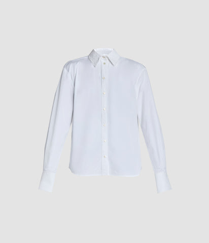 Look 16: Double-breasted tuxedo jacket in black grain de poudre worn with poplin shirt with lace detail and metallised cotton drawstring trousers.