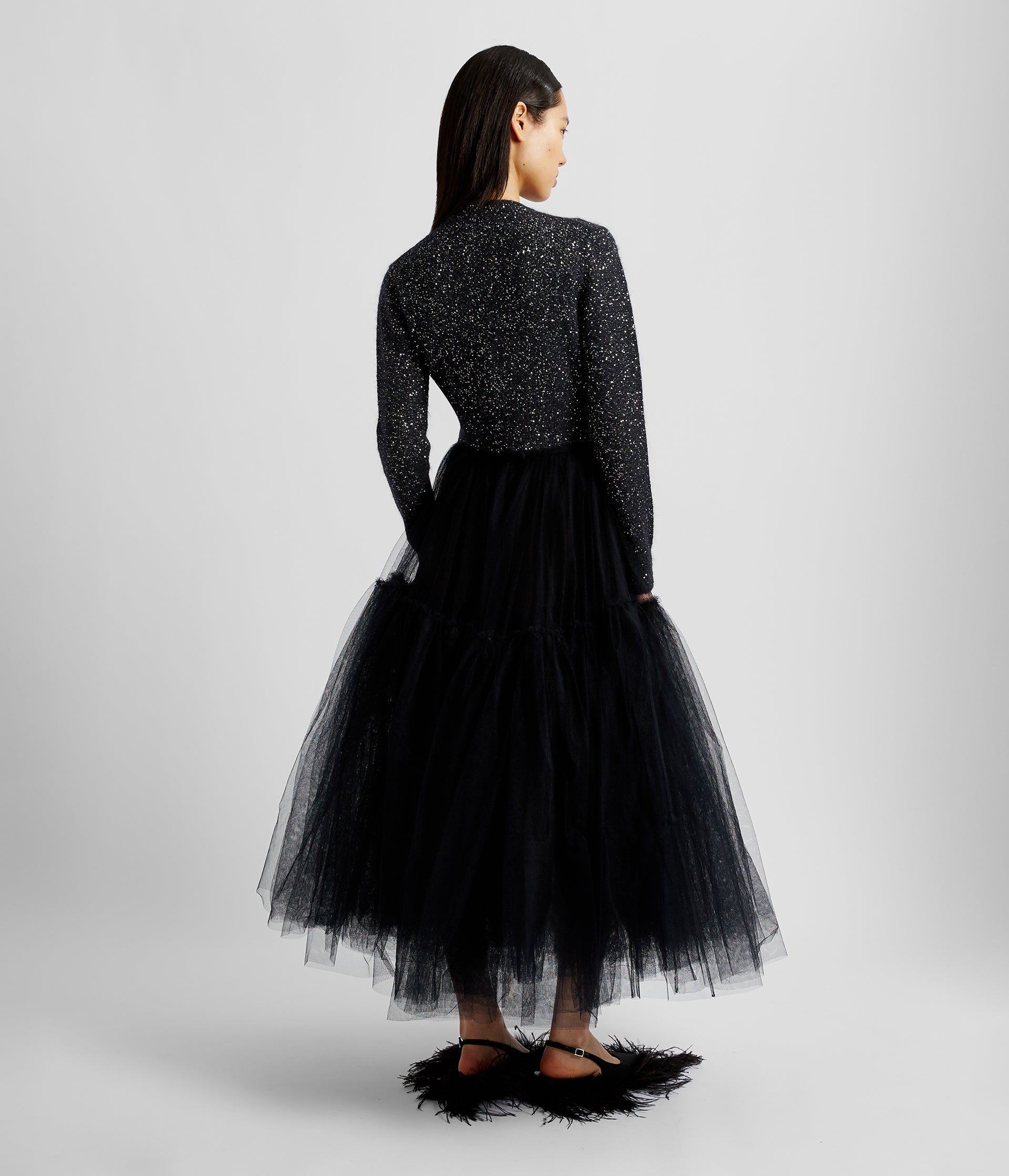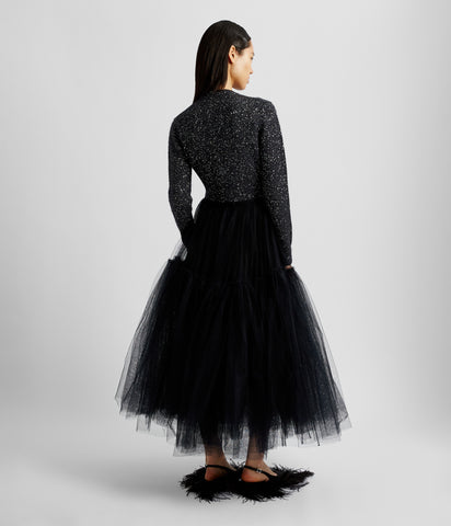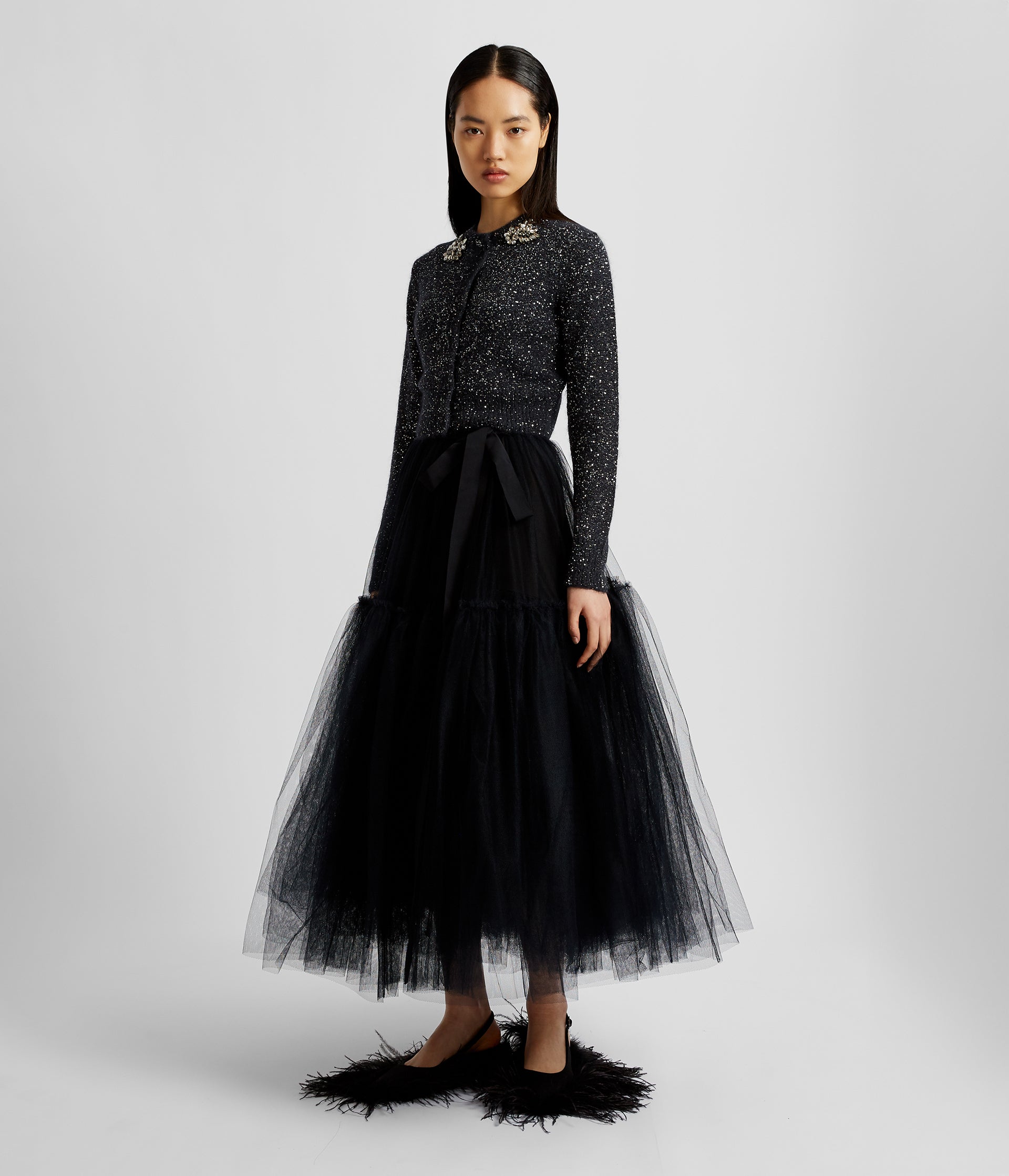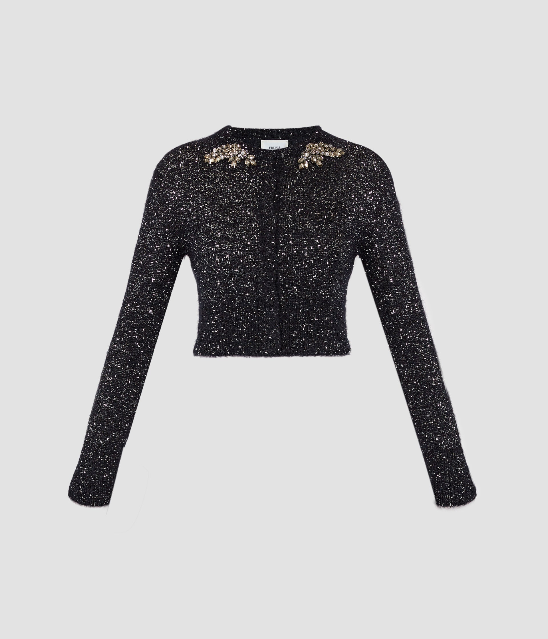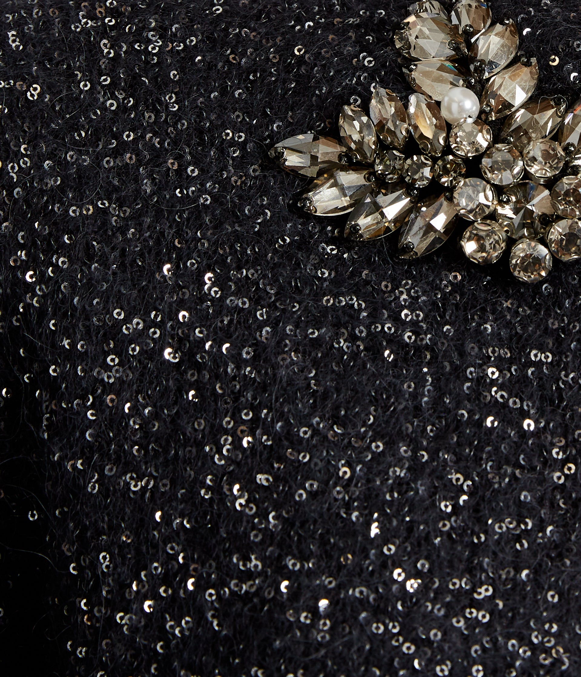 This fitted cardigan is knitted from black alpaca with a silver sequin mouliné yarn running through it. Crystals and faux pearls adorn the neckline.