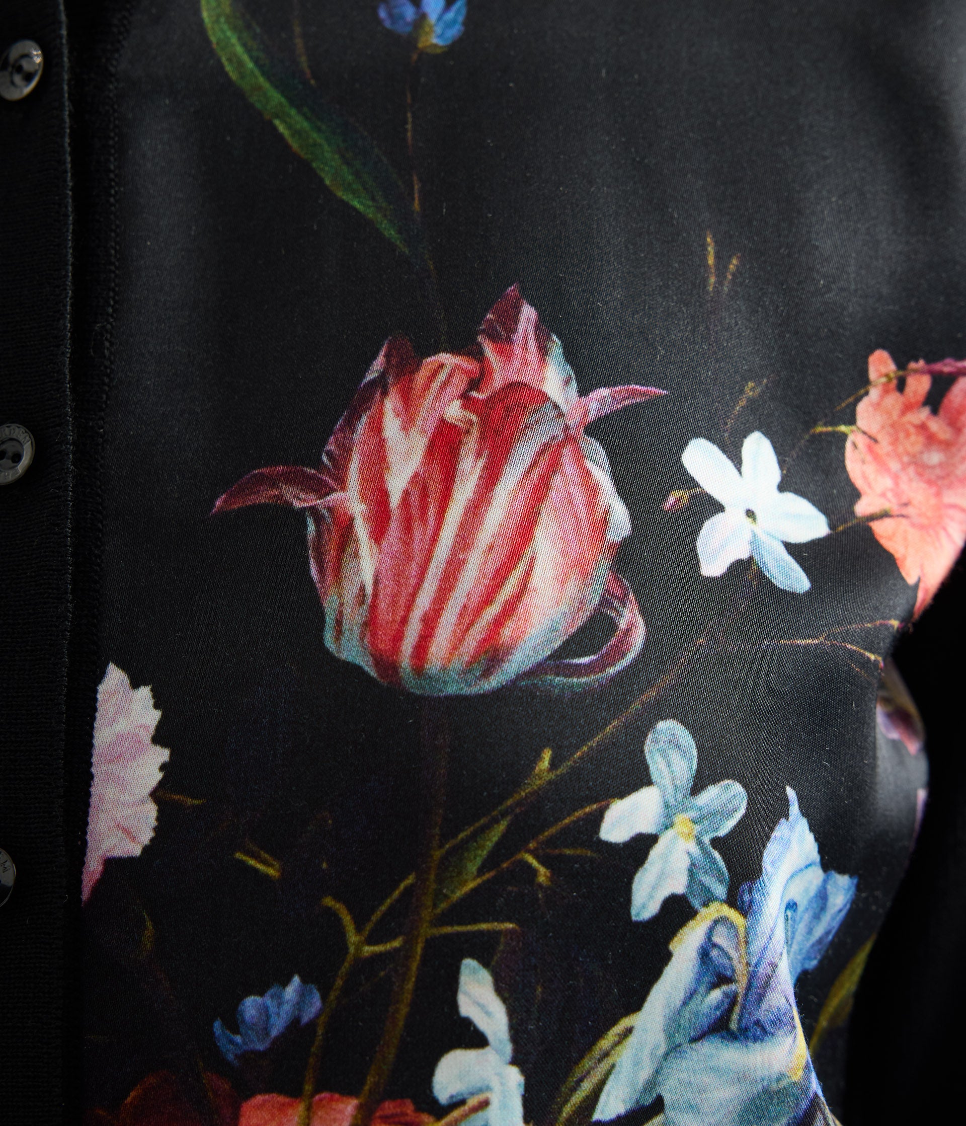 Finely knitted from lightweight merino wool, this black cardigan features satin panels printed with Dutch masters-inspired florals.