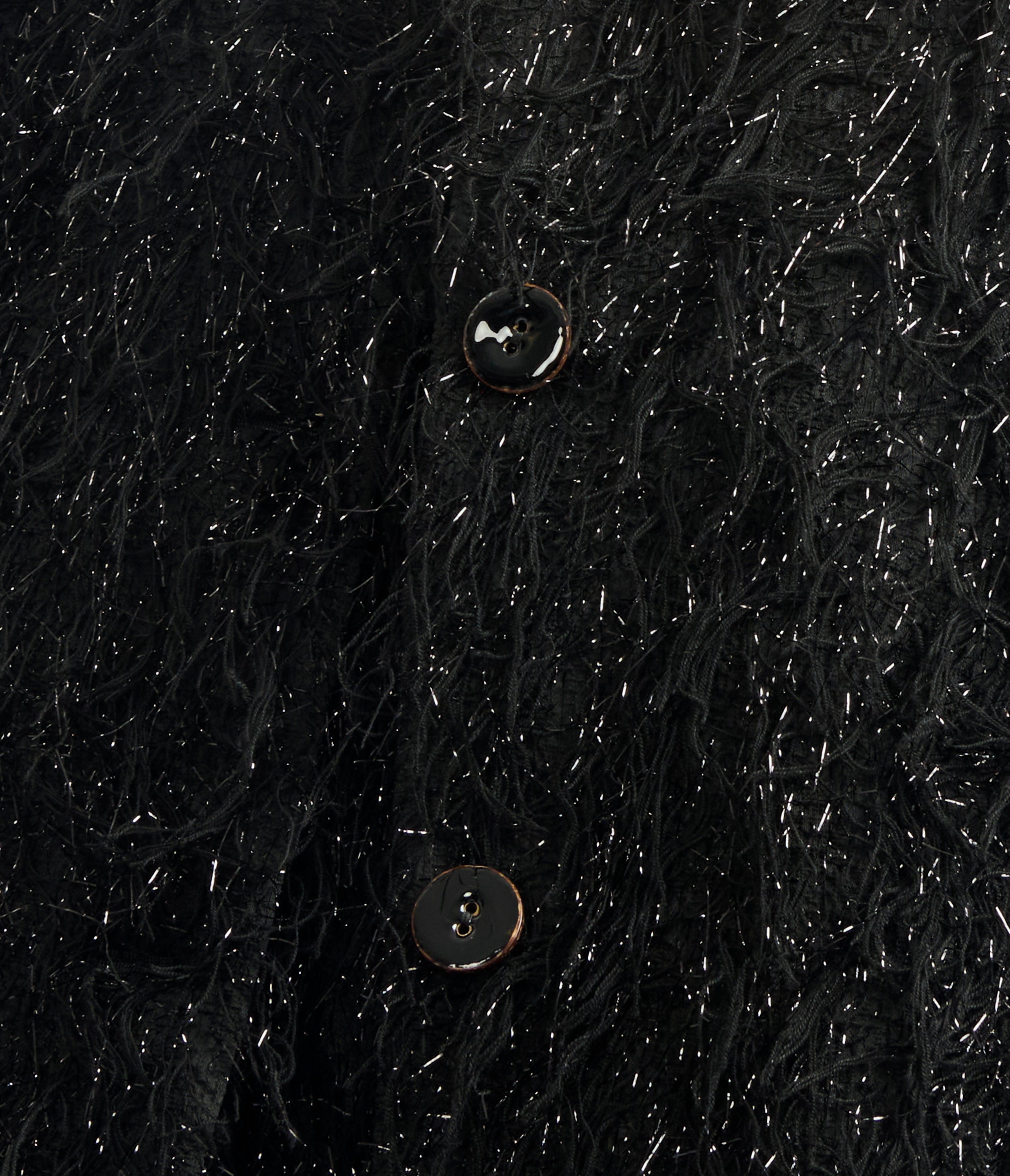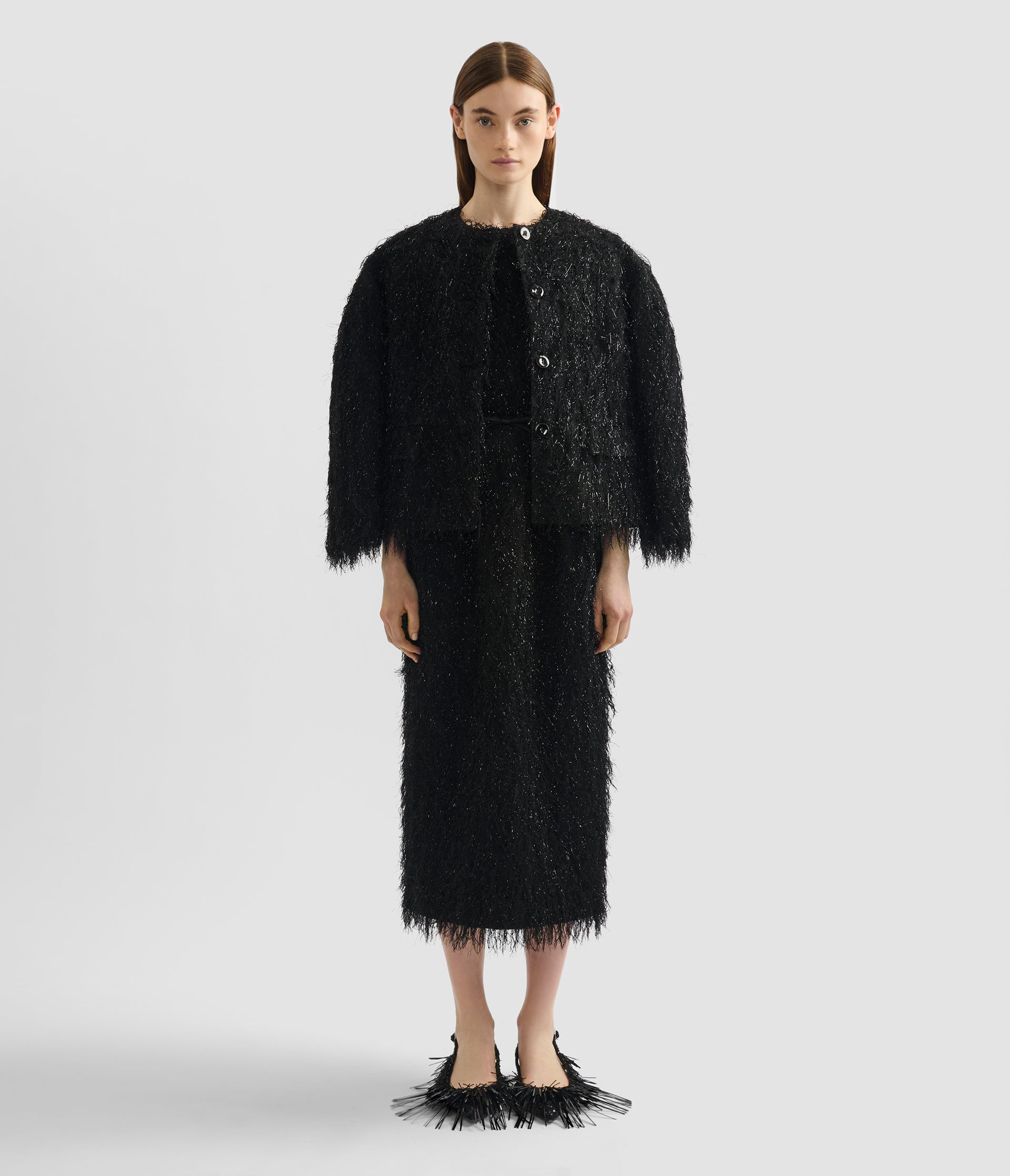 Cut for a cropped, boxy silhouette, this black jacket is made from lurex fil coupé, a tactile fabric combining texturized matte and shiny threads.