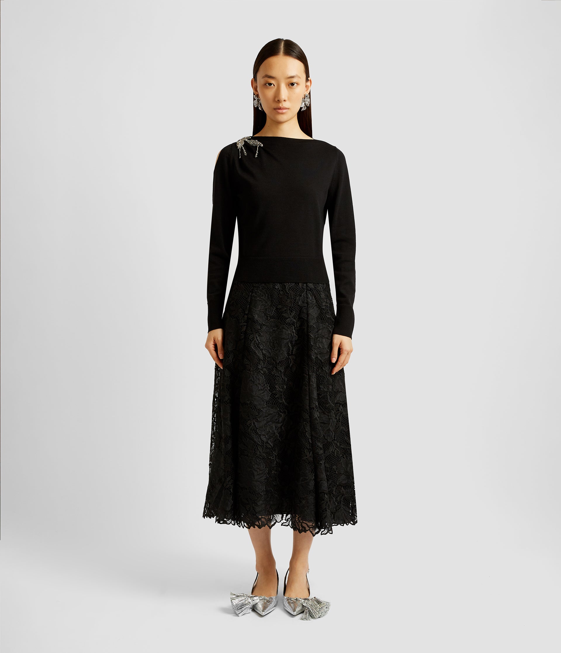 Knitted from pure merino wool, this black jumper is shaped for a slim, cropped fit and features a boatneck and long sleeves. It is gathered at one shoulder and decorated with a beaded embellishment.