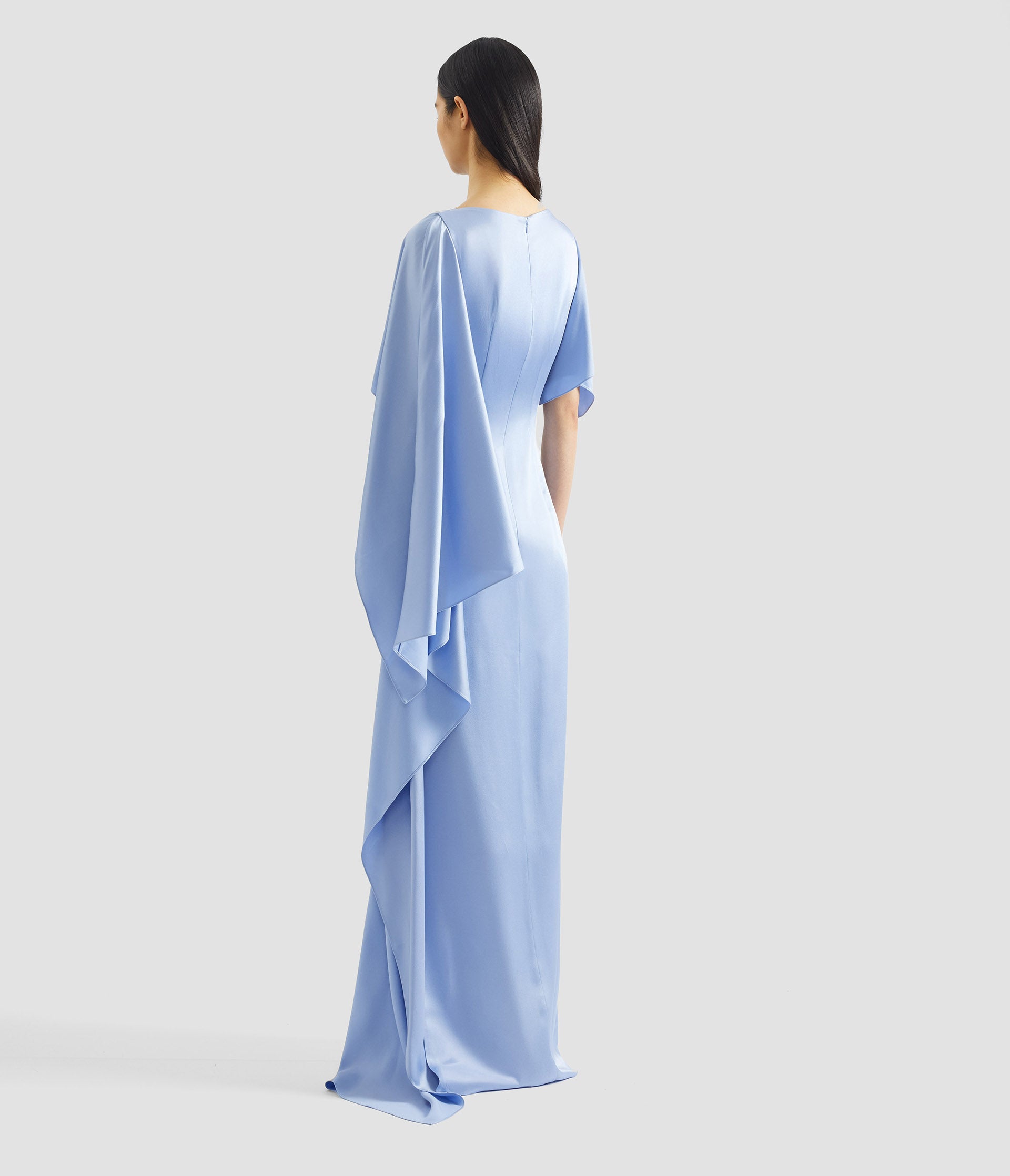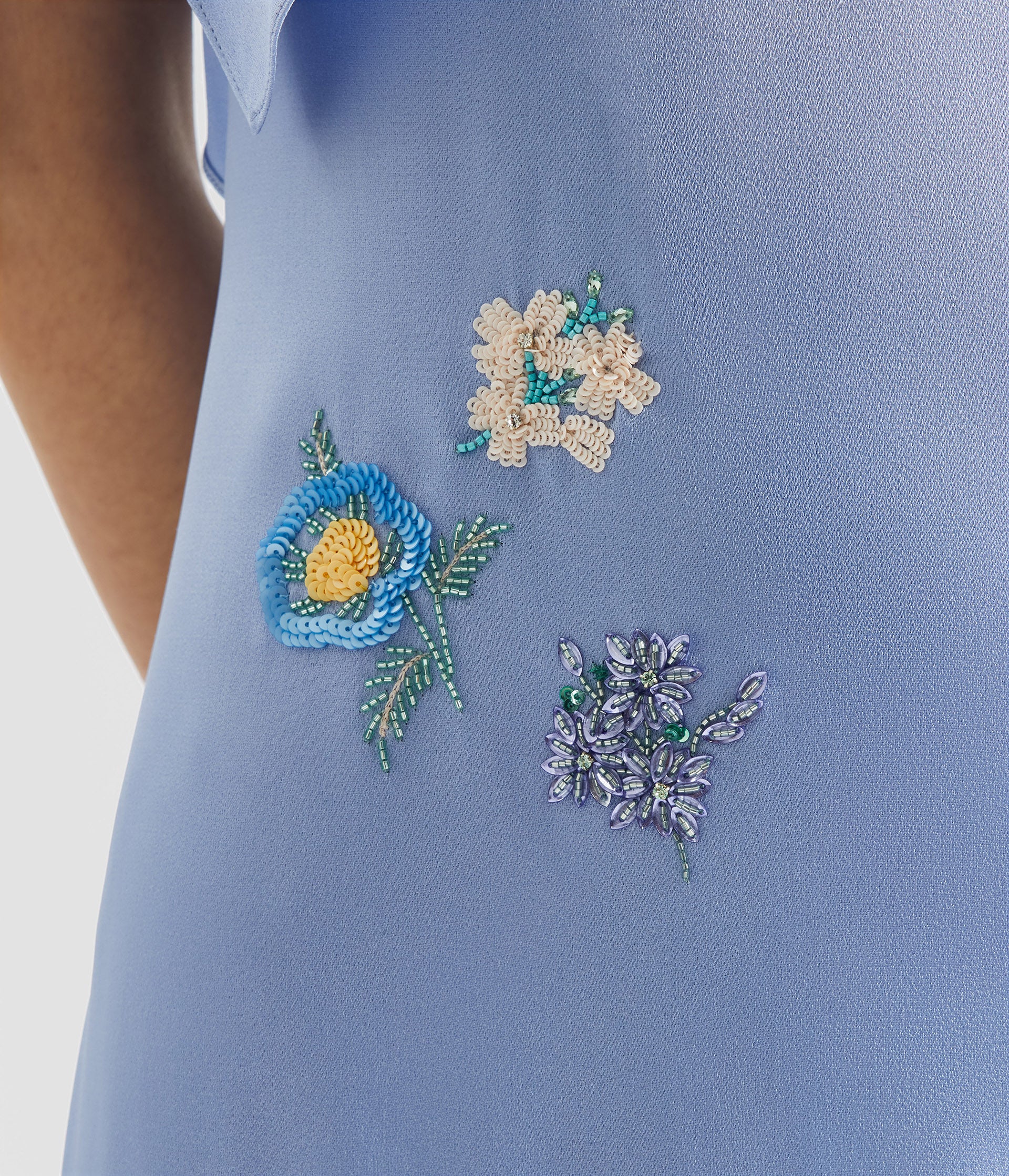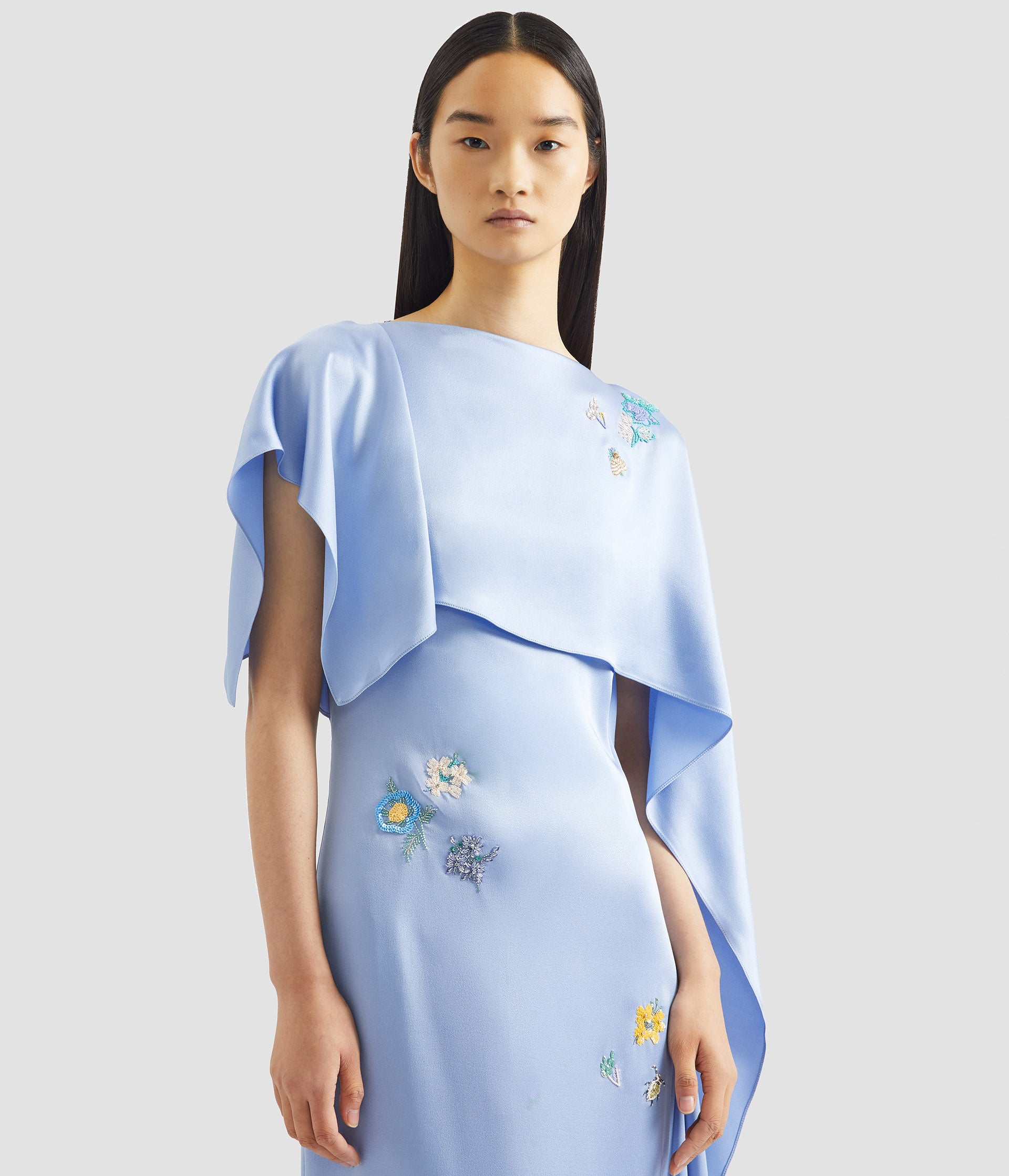 This gown is draped from wisteria satin cady for an elegantly fluid silhouette. The fabric is decorated with colourful embroidery depicting flowers and leaves using a mix of sequins, crystals and beads.