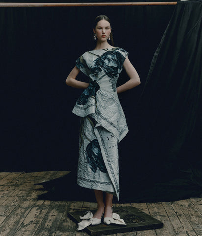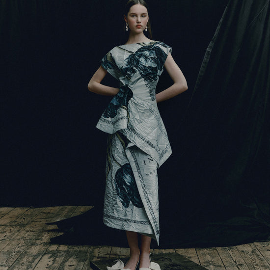 Folded and draped for an asymmetric silhouette, this skirt is cut from powder blue crushed satin twill. The fabric is printed with an oversized tulip design alongside text lifted from books by the season’s muse, German entomologist Maria Sibylla Merian.