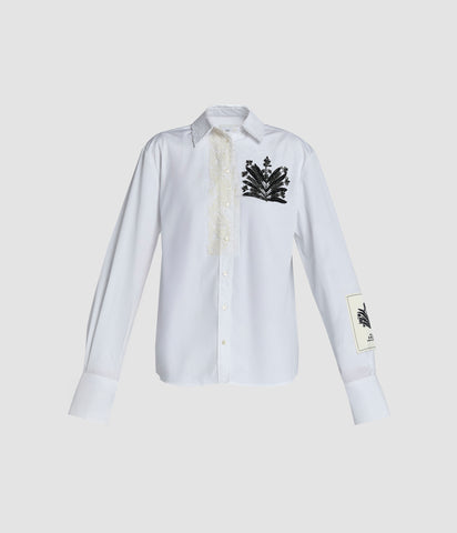 Look 17: White poplin shirt with lace details and jet crystal embroidered symbol worn with deflated cloud skirt in metallised cotton.