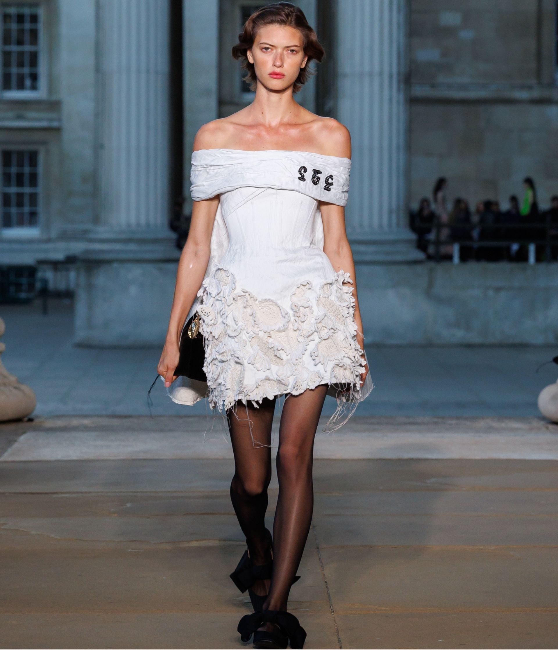 Look 39: Watteau mini dress in ivory metallised cotton with crochet appliqué and jet crystal embroidered symbols.