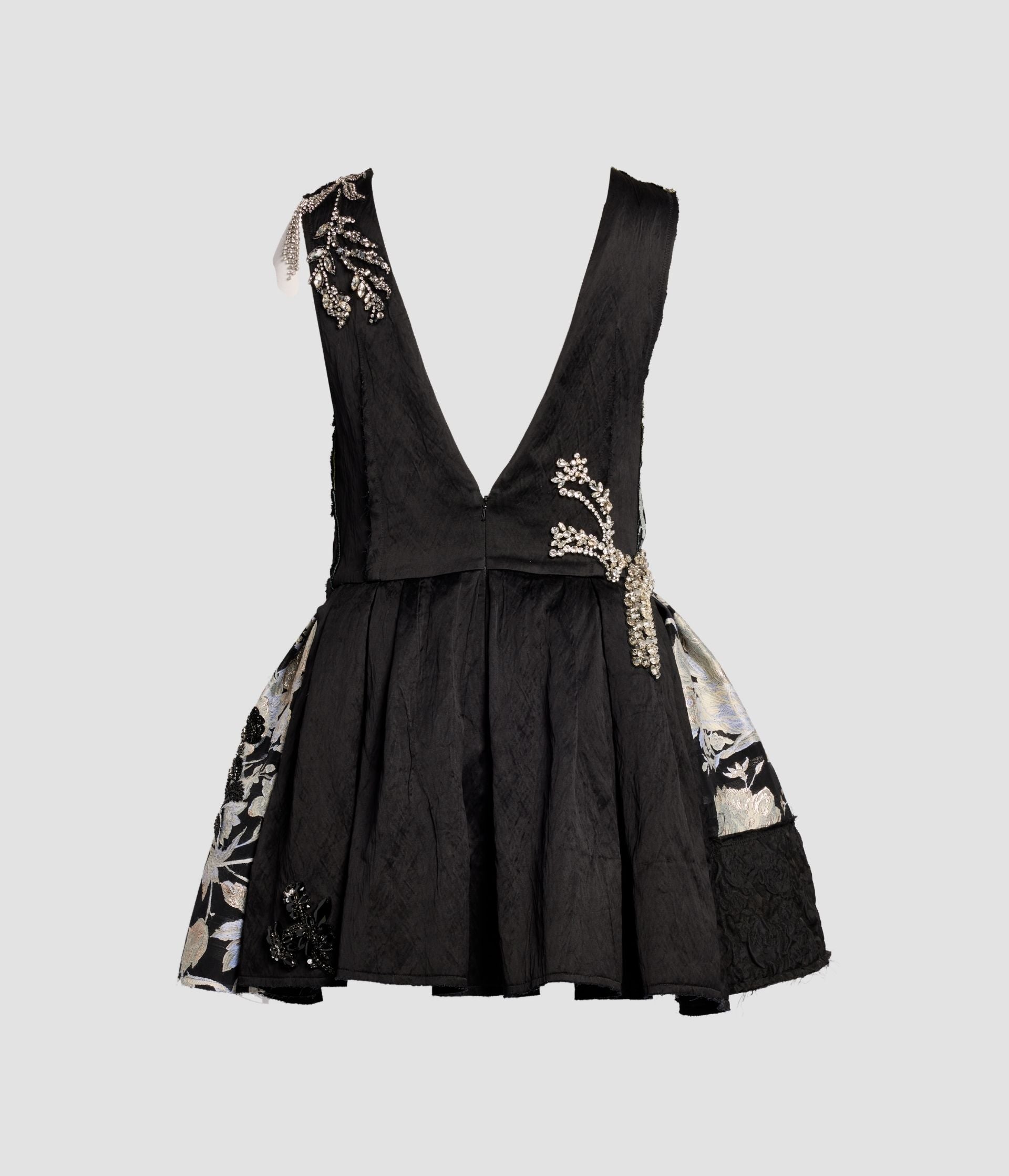 Titled The Imaginary Conversation, the Autumn Winter 2026 collection marks 20 years of ERDEM.Look 2: Collaged pannier mini dress with a knotted canvas bodice, crystal-embroidered fragments and mixed jacquard off-cuts.
