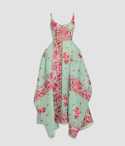 Look 27: Parka in hessian with spliced historical threadwork embroidery worn with skeletal pannier dress in mint organza cloqué with spliced historical threadwork embroidery.