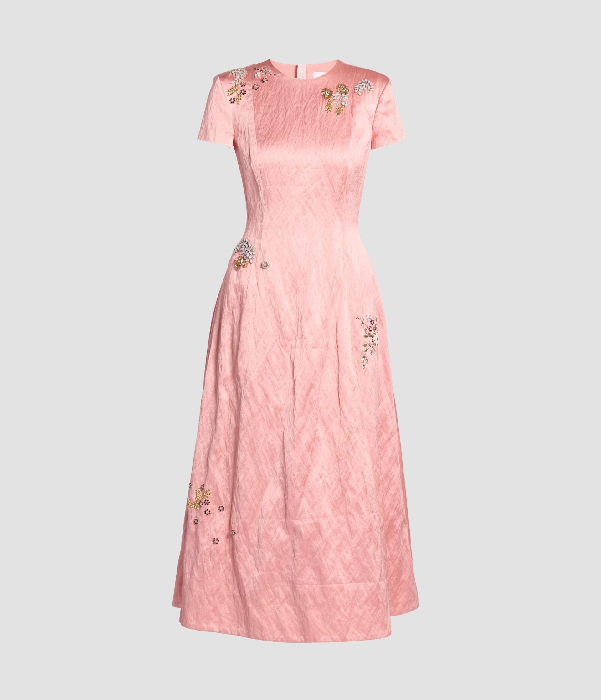 Emroidered Textured Satin Short Sleeve Midi Dress