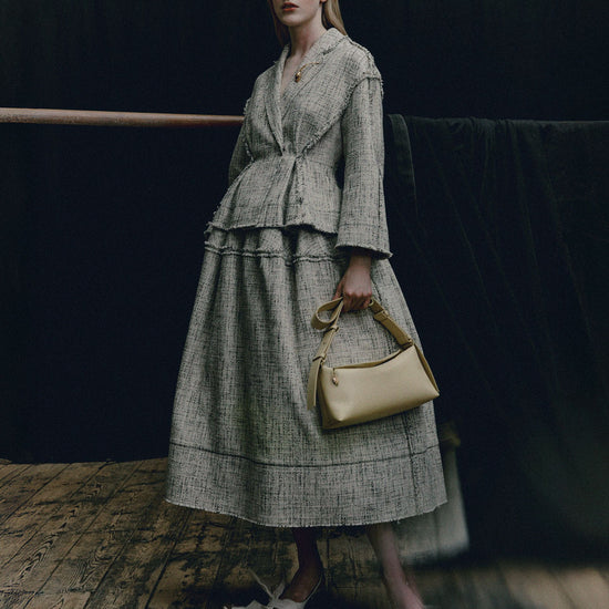 This jacket has a fitted waist and peplum hem. It is made from alabaster and black tweed using mouliné yarns to create the flecked finish. Raw edges at the hem, cuffs, and seams offer additional tactility.
