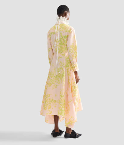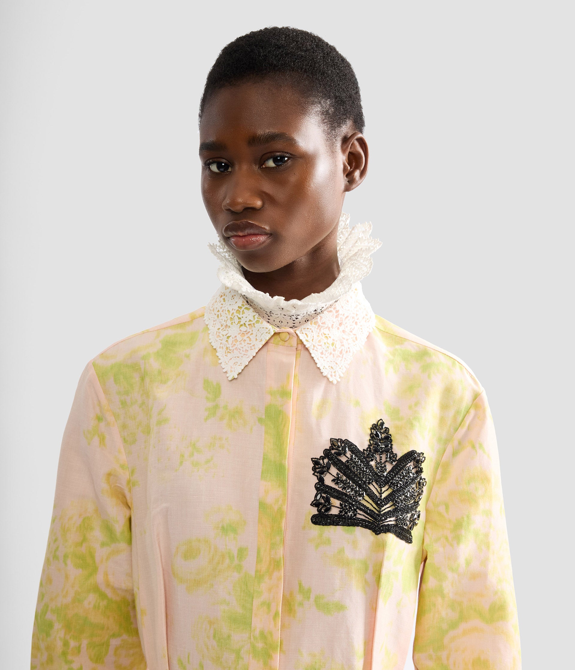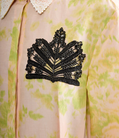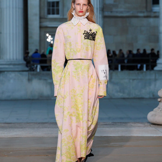 With a fitted bodice and voluminous skirt, this rose and chartreuse shirt dress cuts a dramatic silhouette. It is made from lightweight linen chine which is printed with bouquets of roses. The jet black crystal embroidery is a symbol seen throughout the SS26 collection.