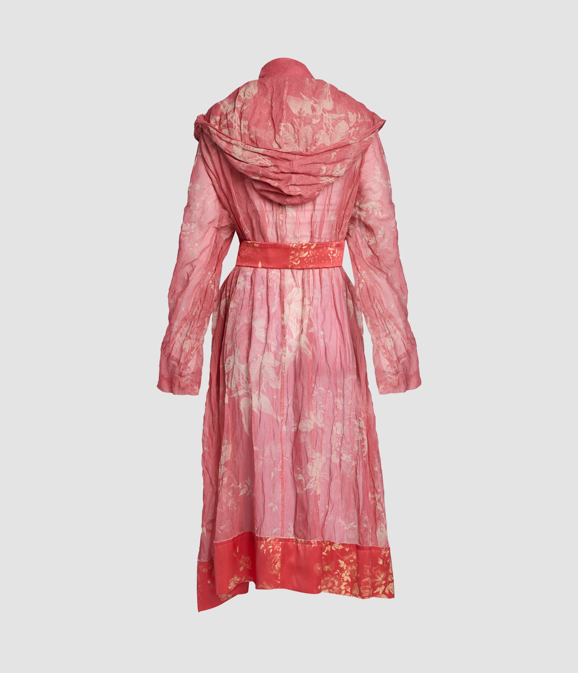 Look 28: Parka in pink-printed metallised linen gauze worn with draped column dress in printed crêpon.