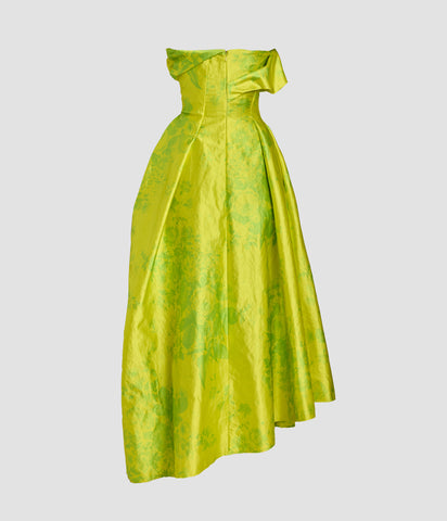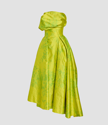 Look 33: Mid-length cloud dress in chartreuse floral-printed washed satin.