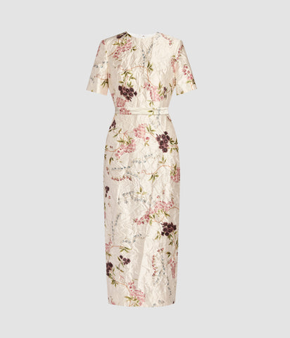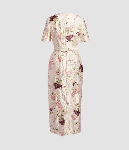 Floral Print Textured Satin Midi Pencil Dress