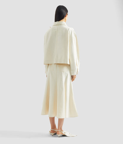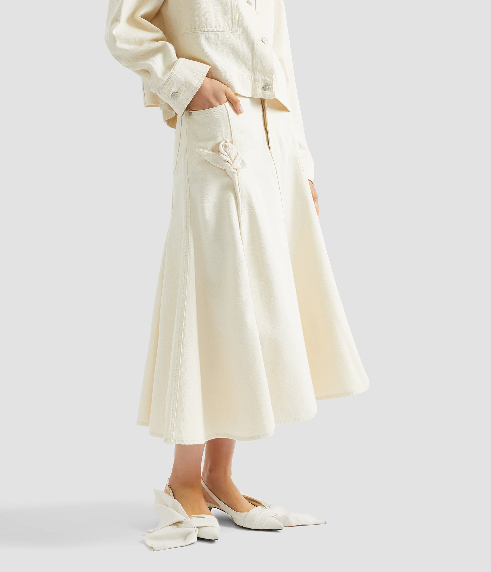 This skirt is made from heavyweight ecru denim for a structured, A-line silhouette. It is detailed with a tonal three-dimensional tulip.