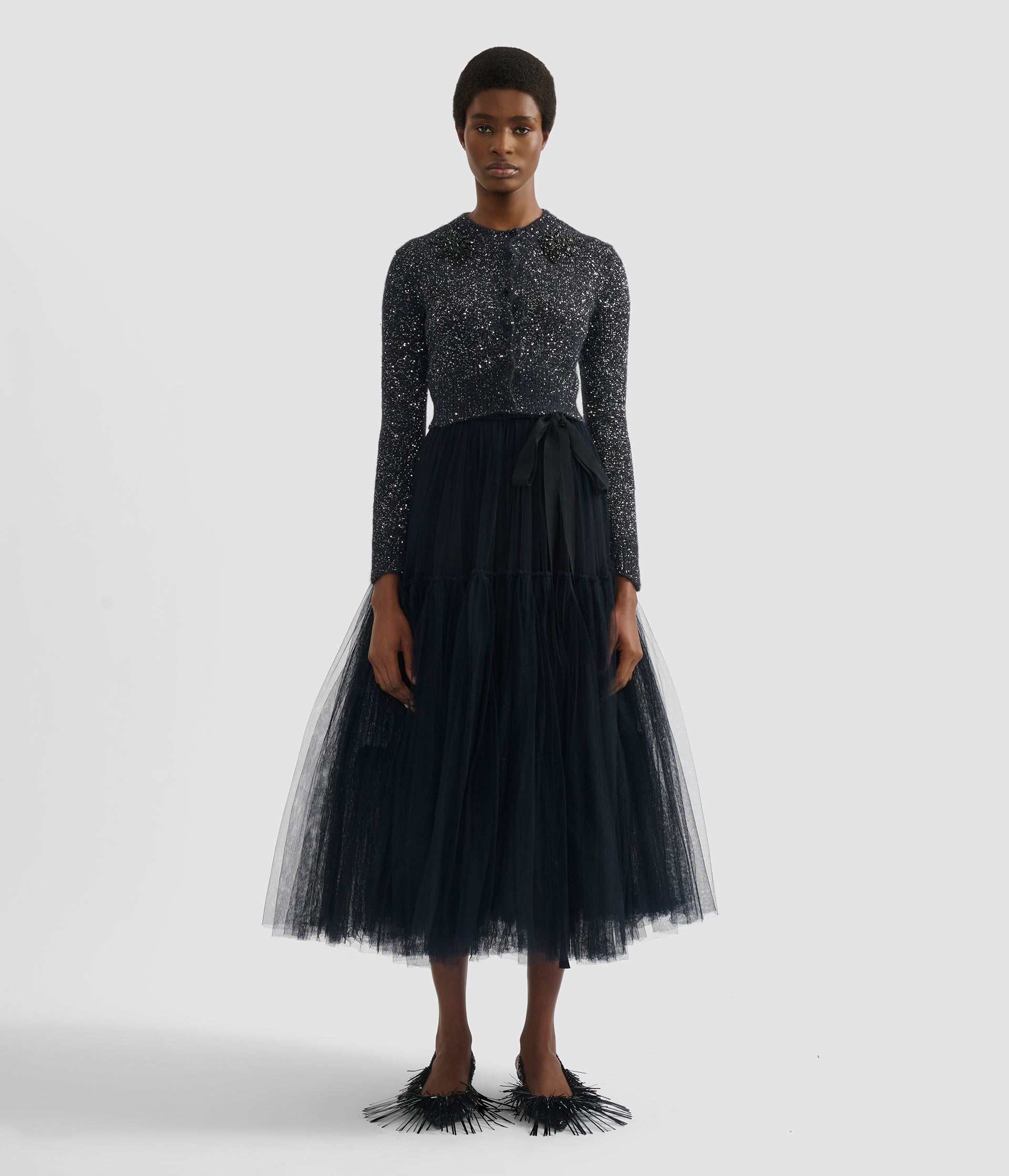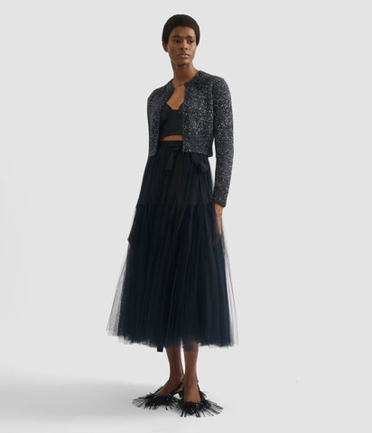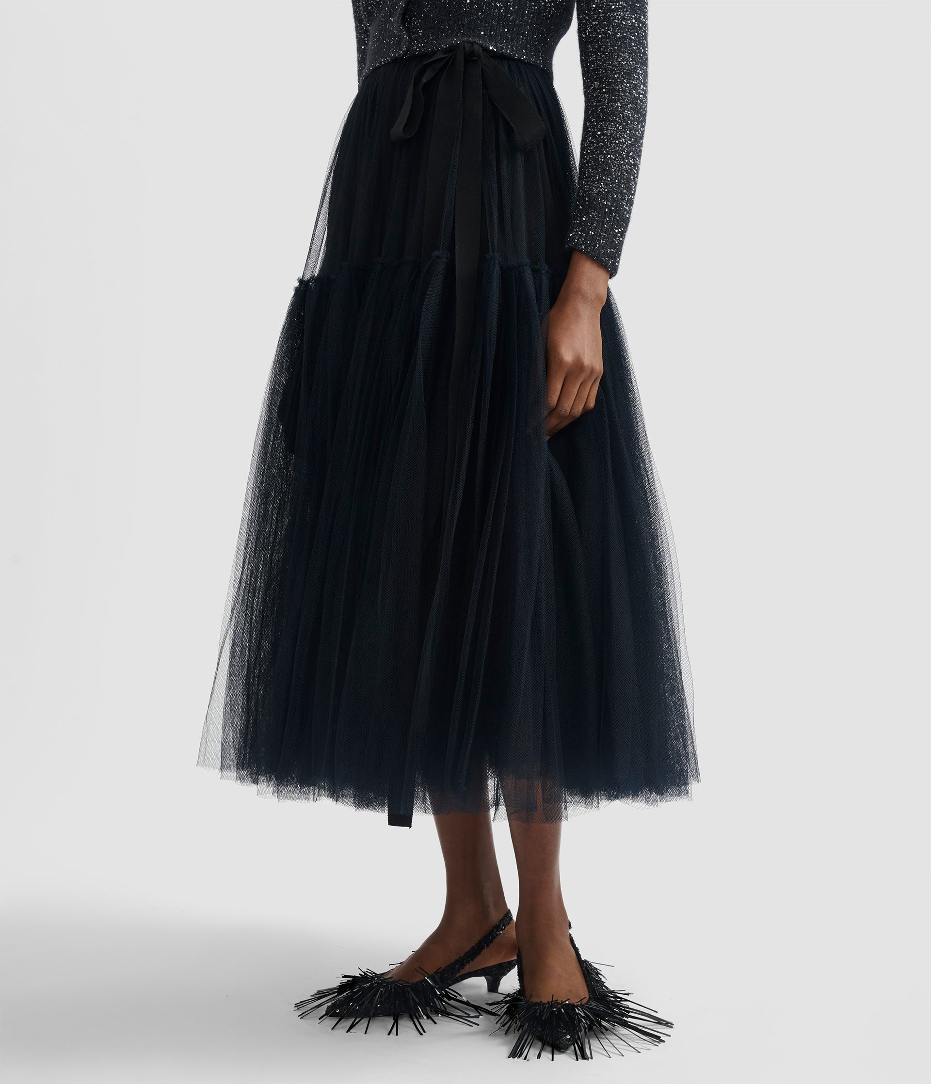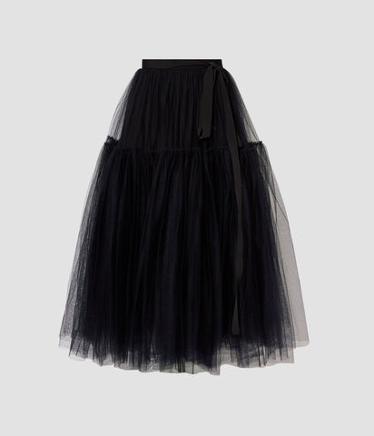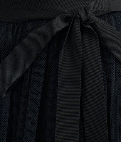 Crafted from layers of sheer black tulle, this skirt shapes a full silhouette. It is enhanced by a grosgrain bow belt.