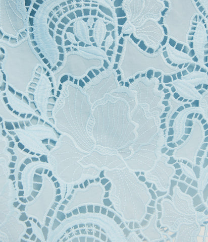 Gathered at the waist, this mid-length skirt cuts a full, A-line silhouette. It is made from blue cotton cutwork featuring a floral design.