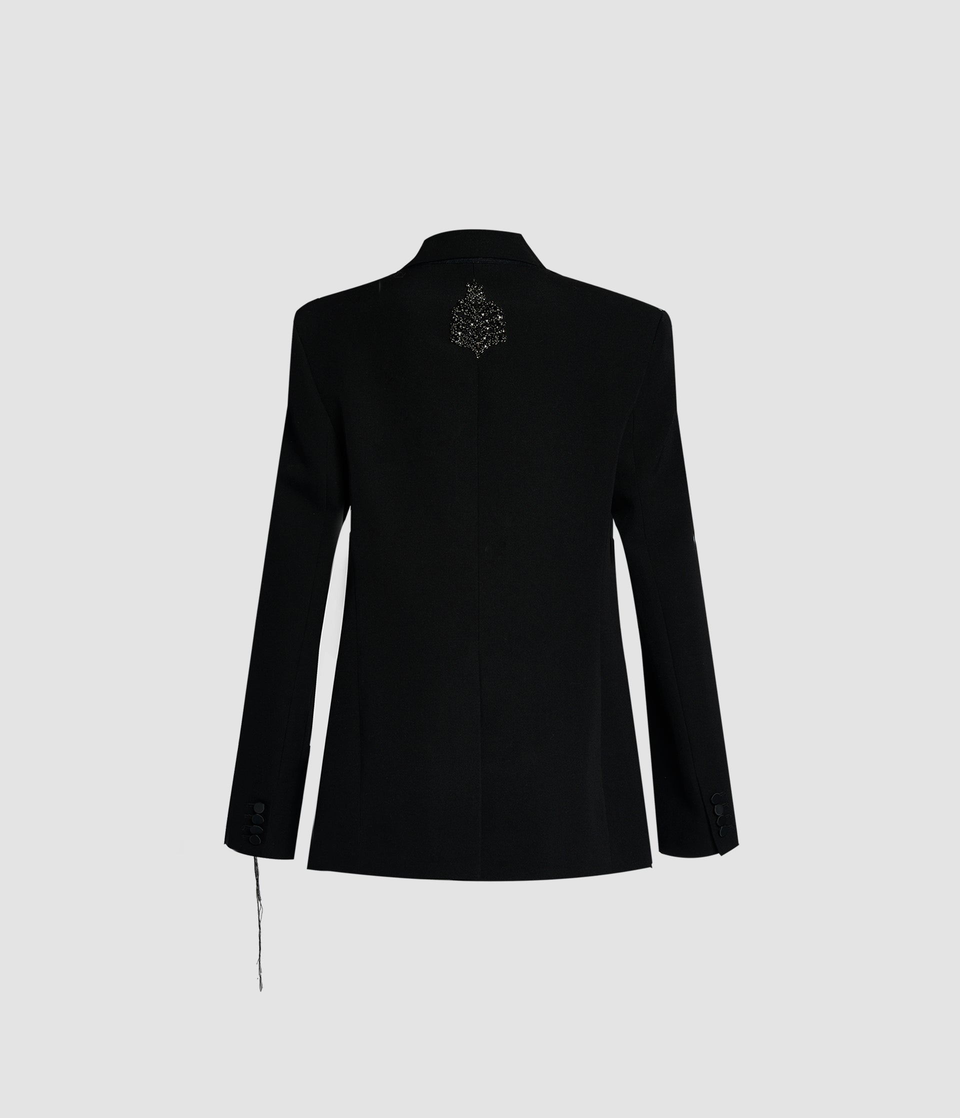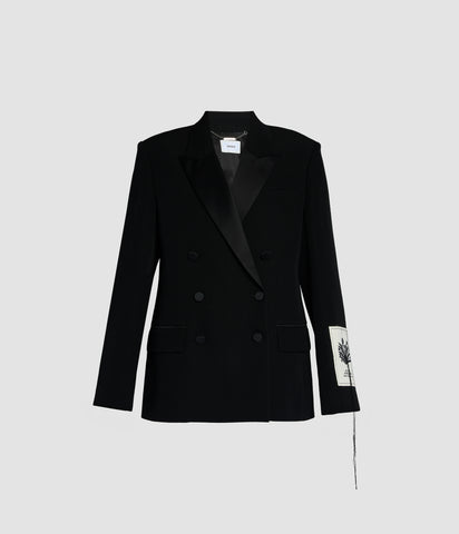 Look 16: Double-breasted tuxedo jacket in black grain de poudre worn with poplin shirt with lace detail and metallised cotton drawstring trousers.