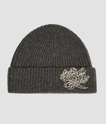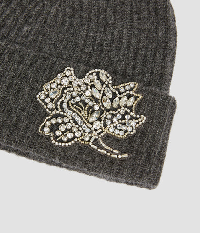 This grey-melange rib-knitted cashmere beanie is embellished with an array of glass crystals and metallic beads placed in a floral formation