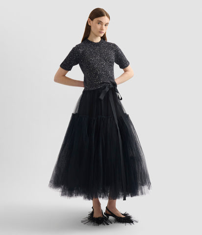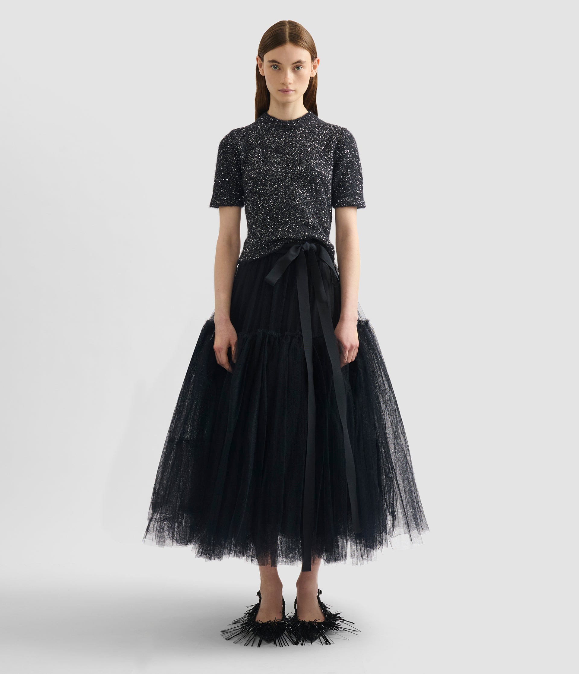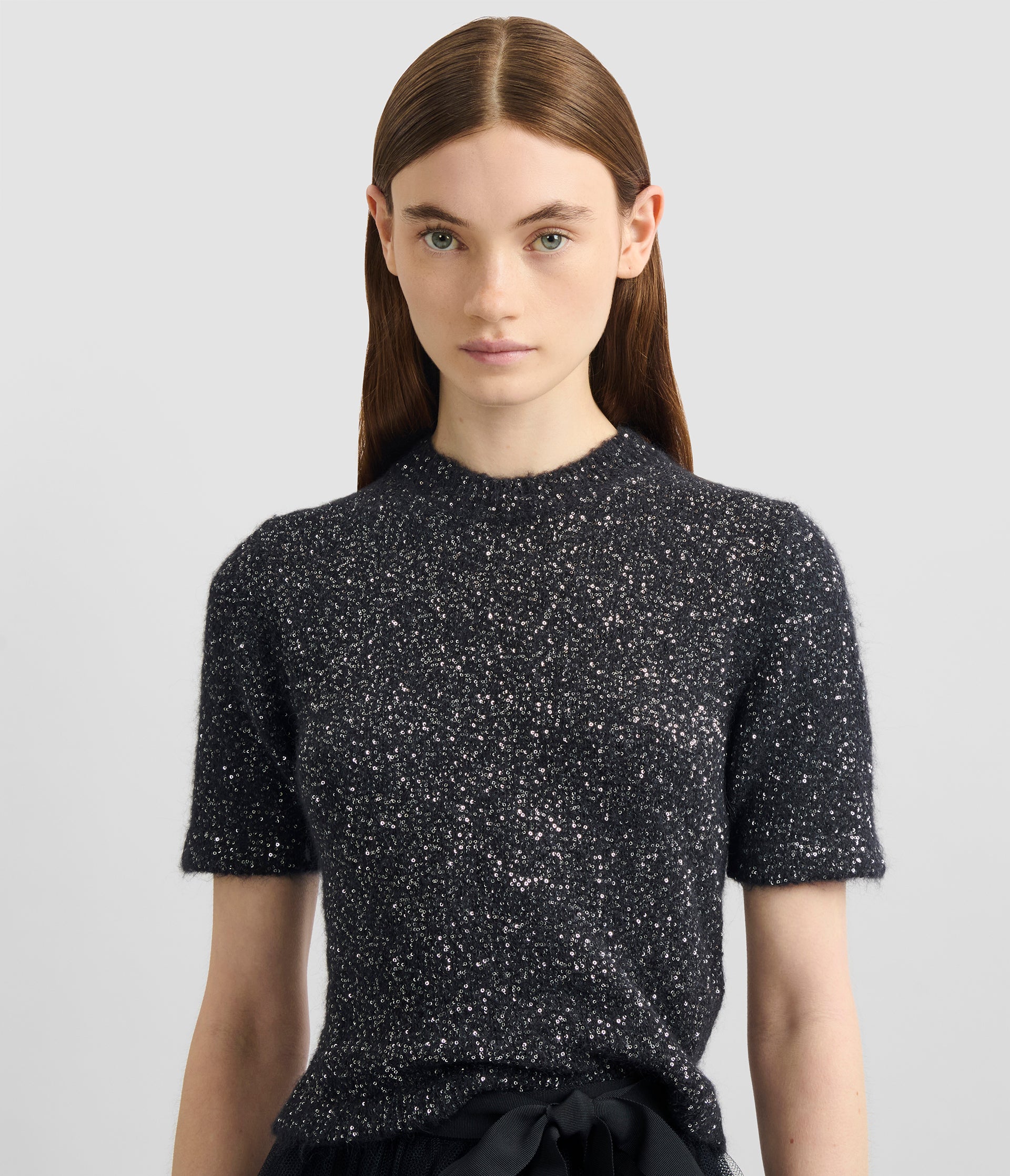 This T-shirt is knitted from a black alpaca-blend and threaded with tiny sequins. It has a close-fitting, cropped silhouette.