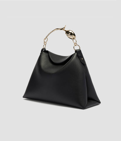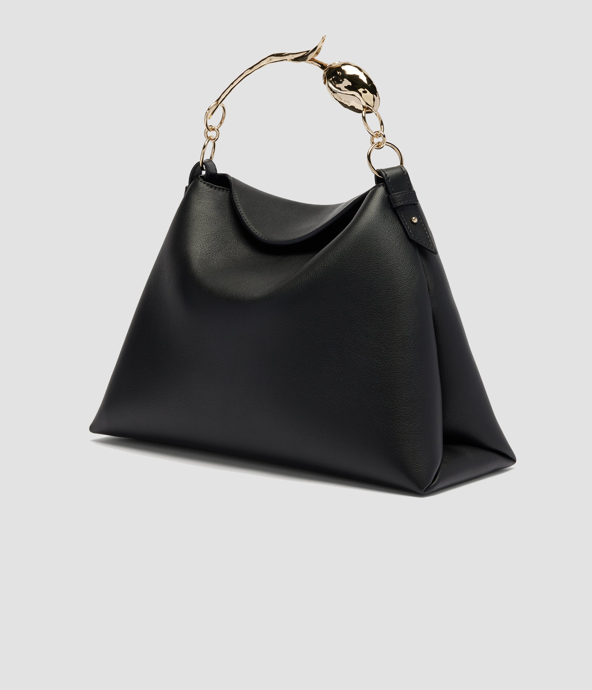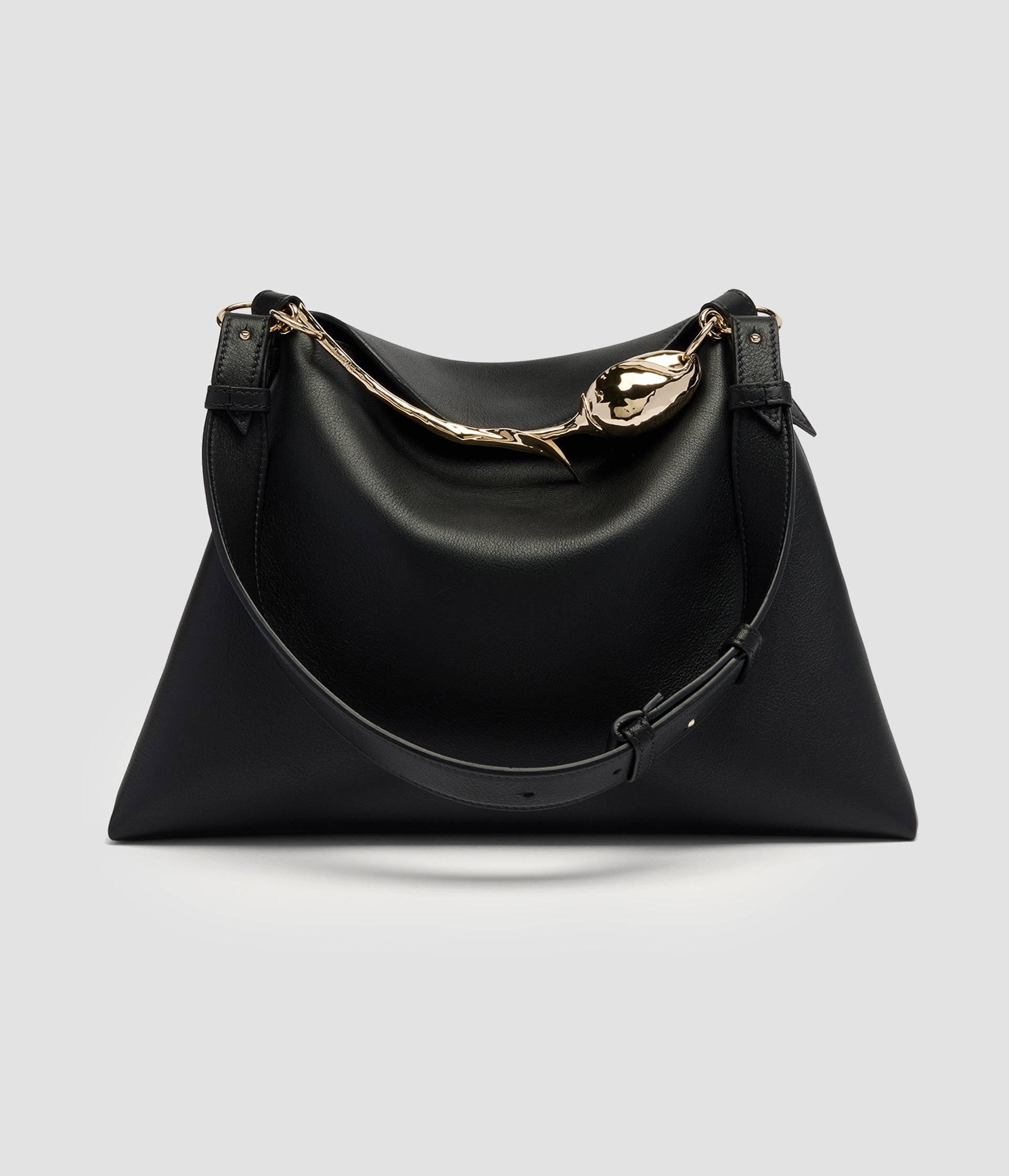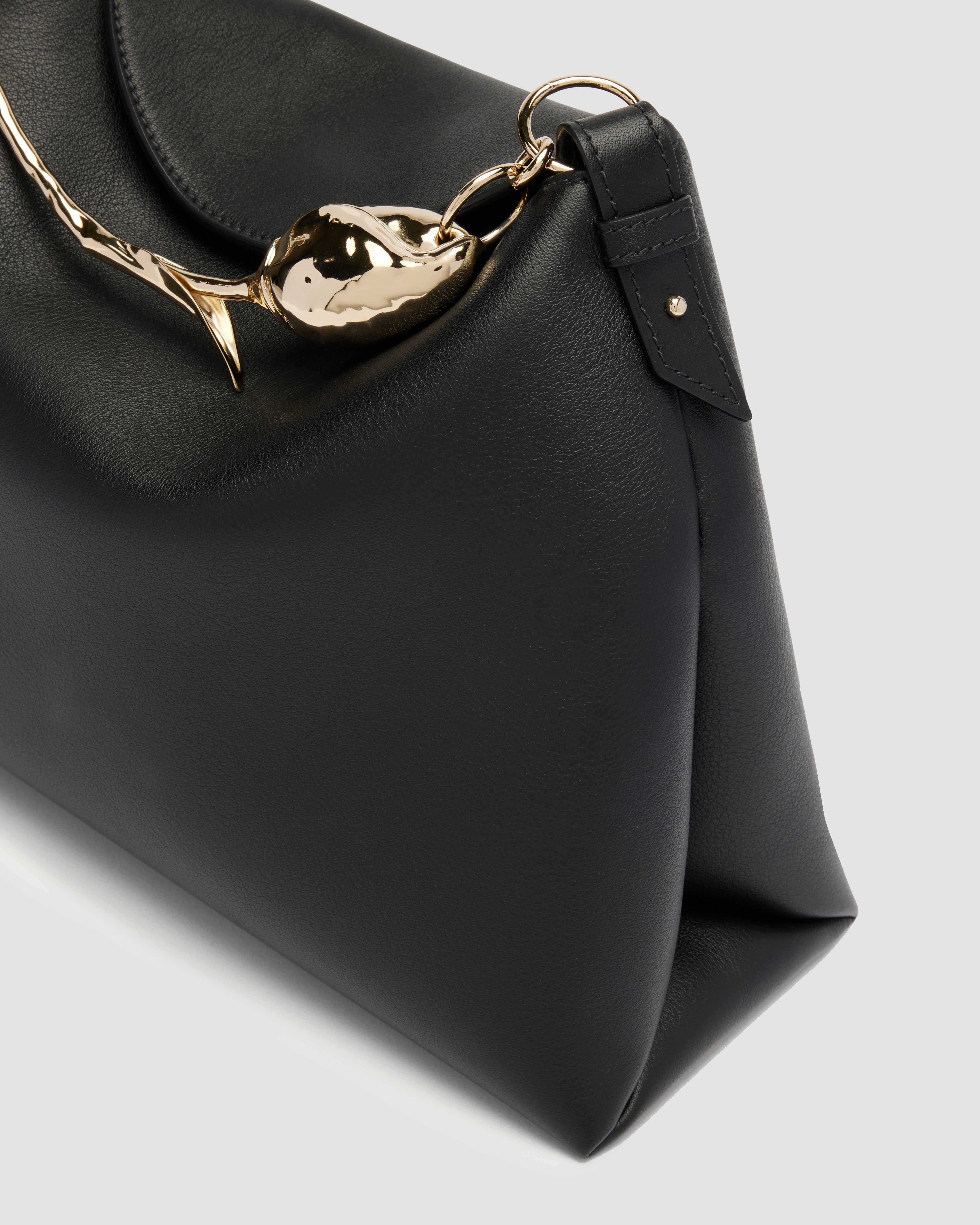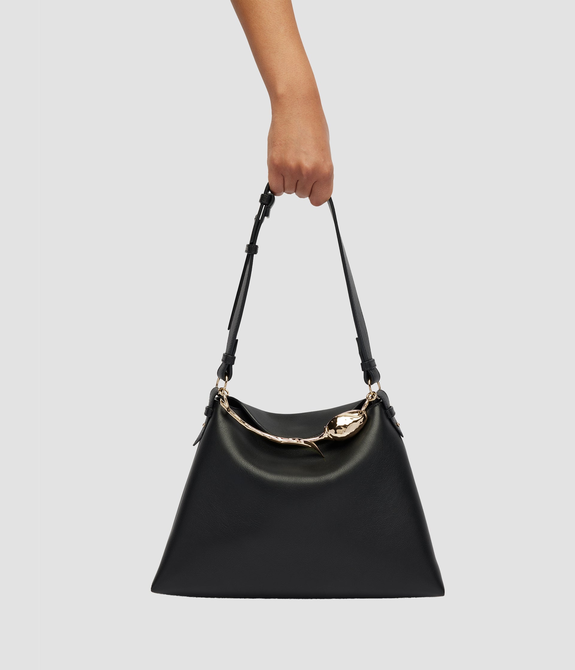 The Bloom Bag's gold-toned flower bud handle takes seven hours to produce using the lost wax casting method. It also features a petal-shaped magnetic top closure.