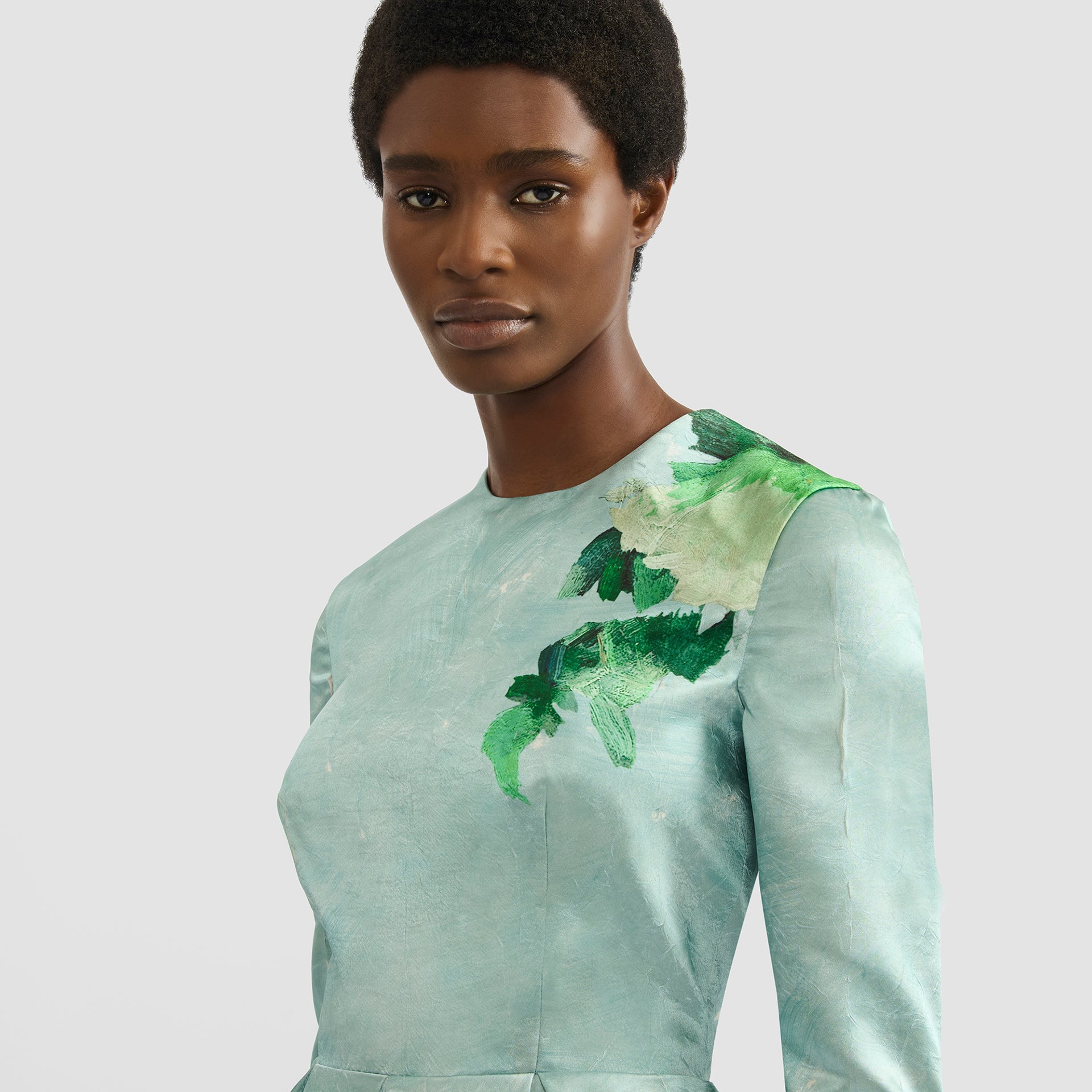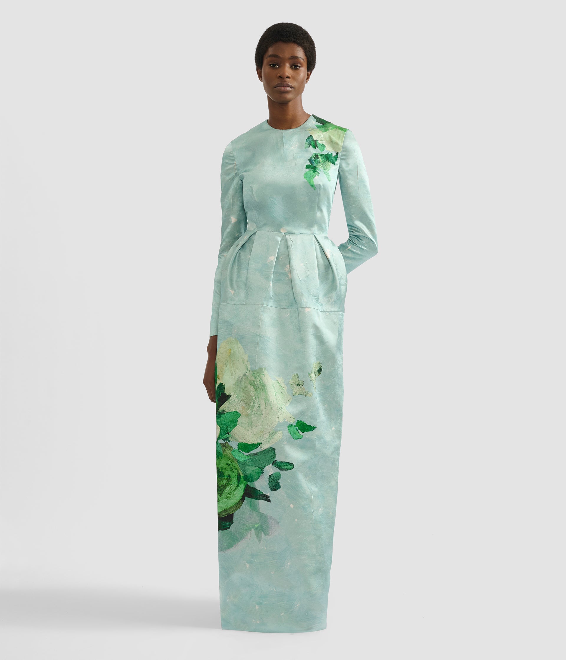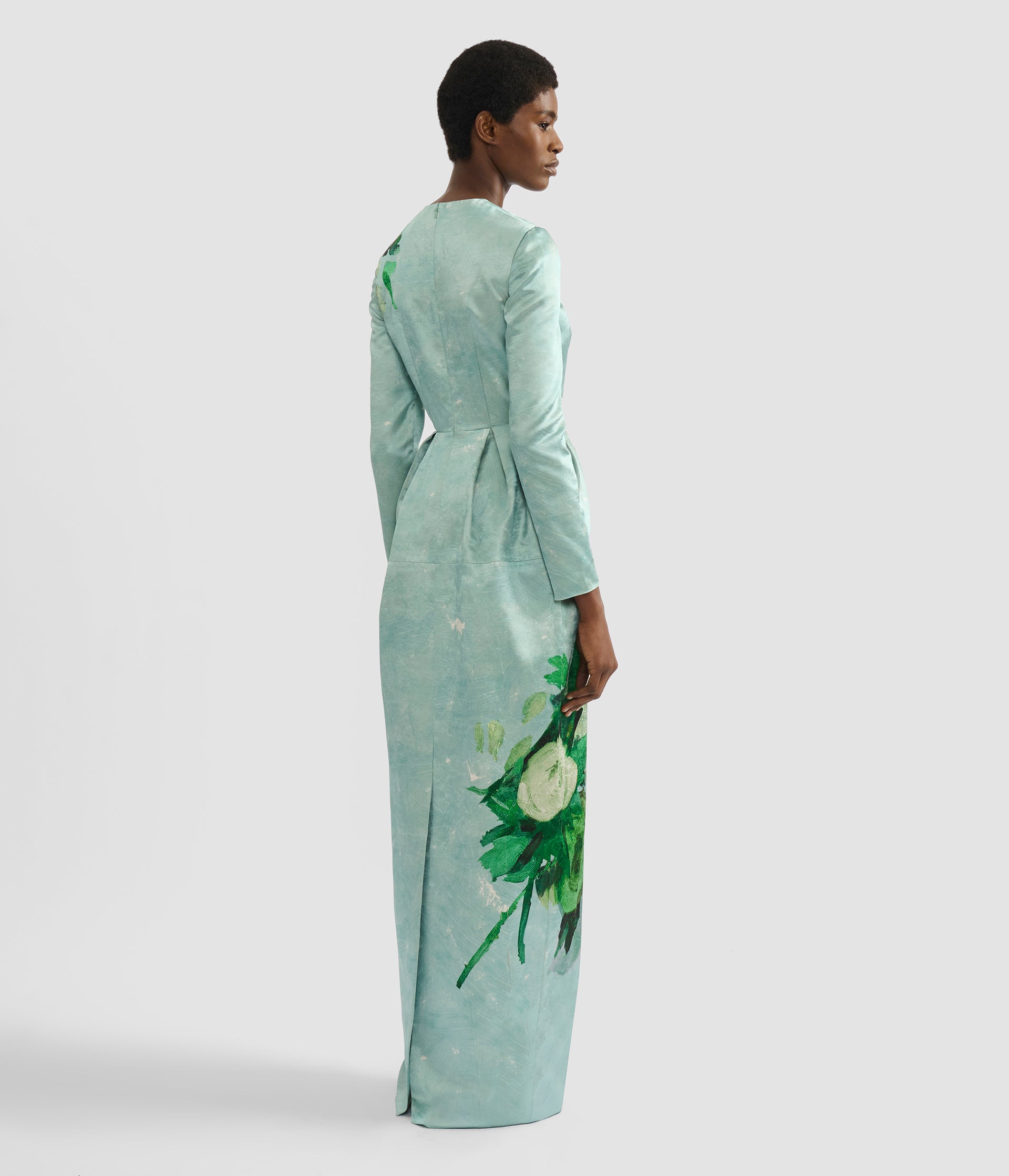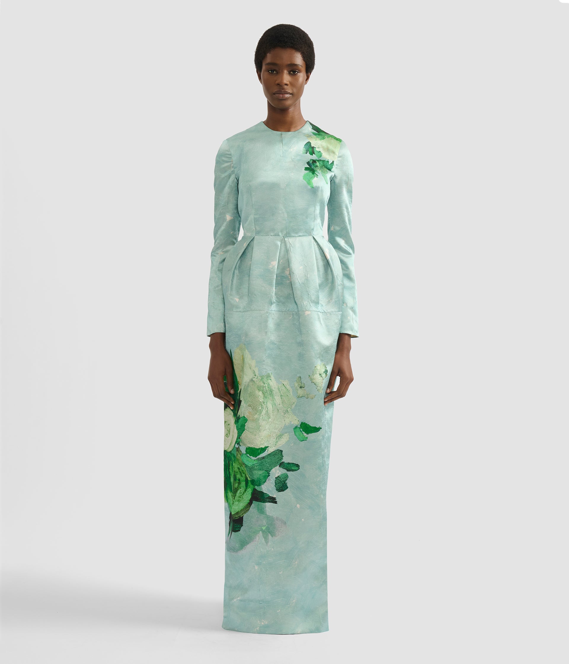 Gathering at the waist gives this gown volume at the hips. It is made from crushed mint satin and decorated with an abstract rose design.
