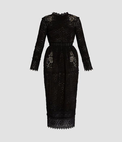 Look 1: Hourglass dress in embroidered black guipure worn with embroidered ivory guipure collar. Styled with Mini Bloom Bag in grass green velvet.