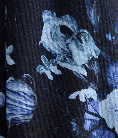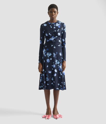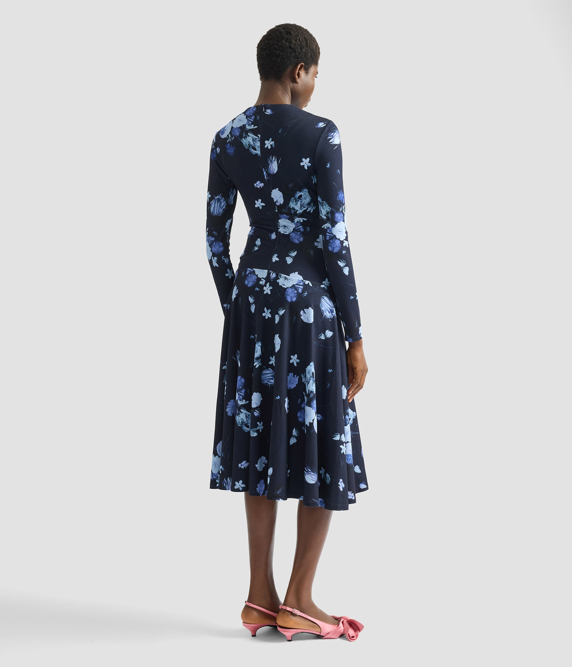 Cut from ponte jersey, this dress has a close-fitting bodice and A-line skirt. It is digitally printed with painterly blue flowers.
