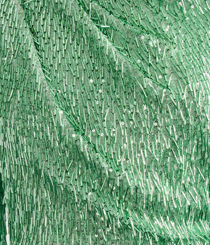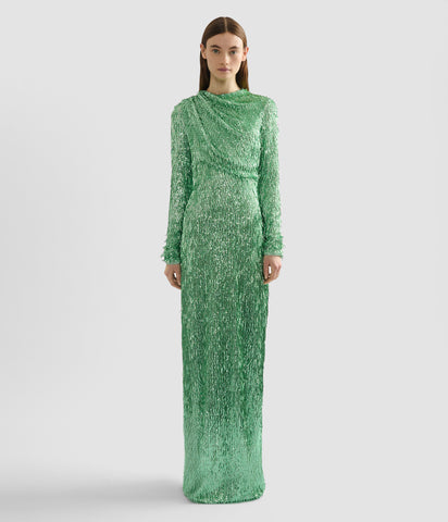 Draped at the neckline and falling to a floor-length hem, this green dress is covered in thousands of sequins and bugle beads.