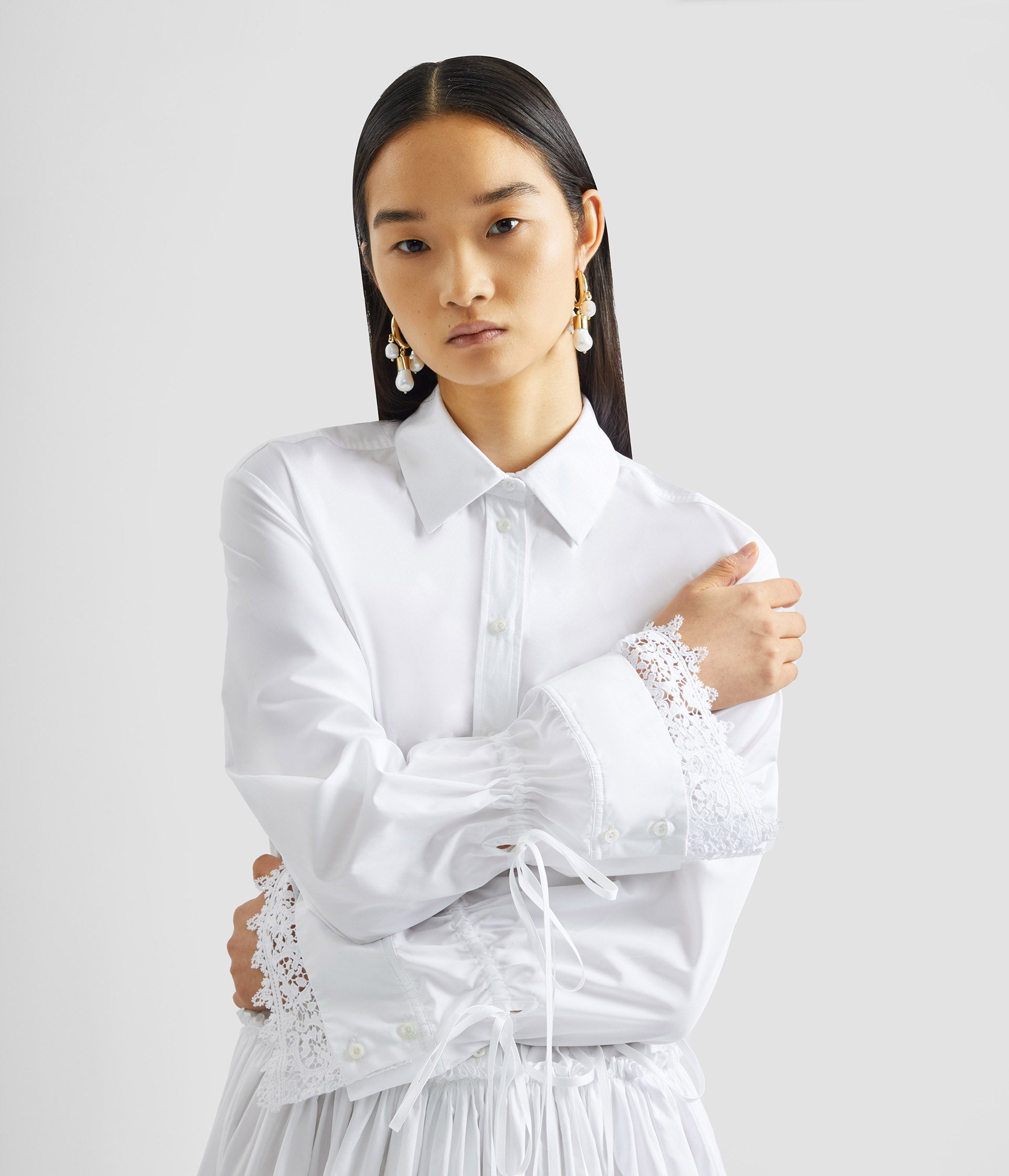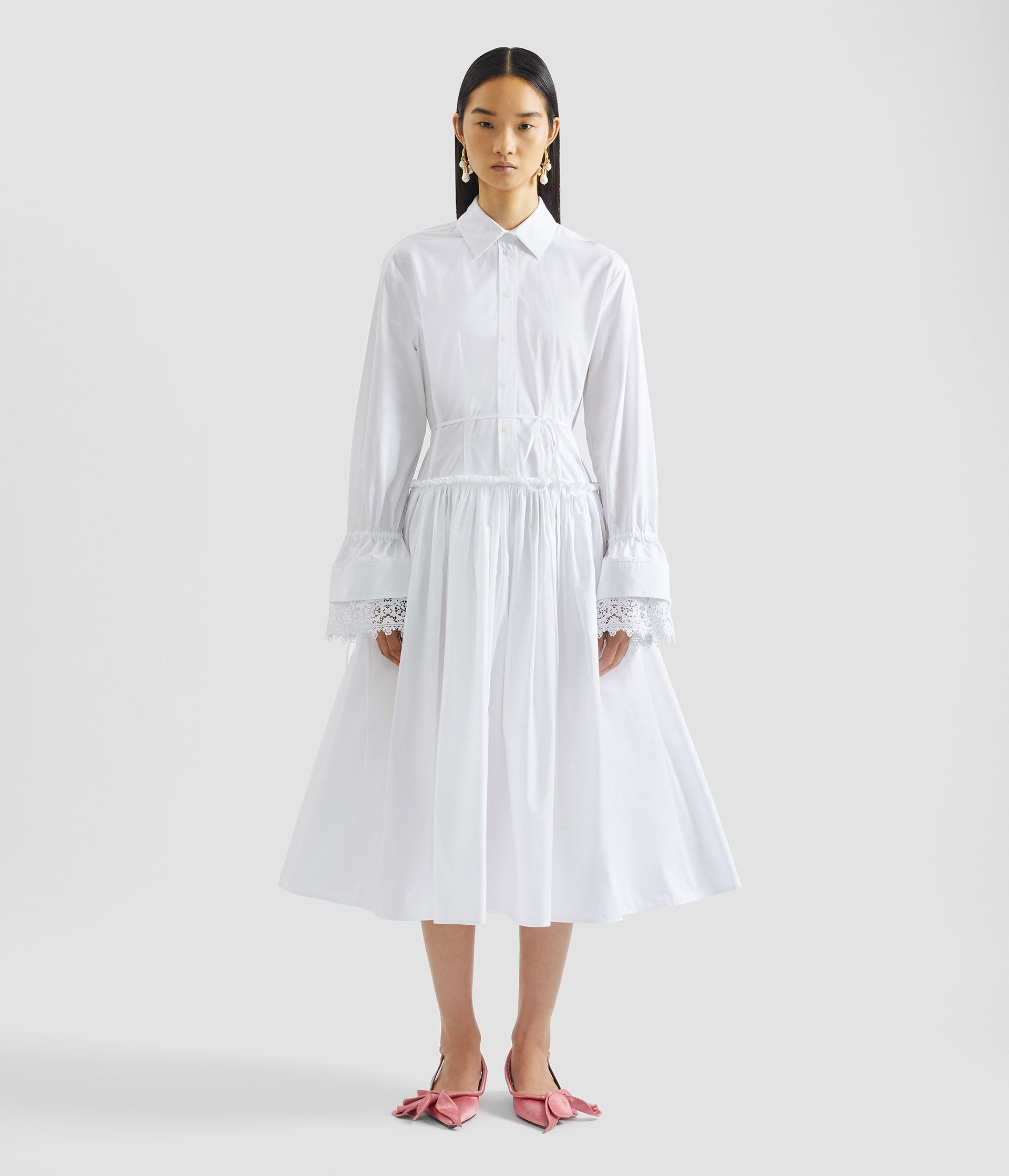 Shaped for a relaxed silhouette, this shirt dress falls to an A-line skirt. It is cut from cotton poplin and has gathered cuffs with delicate lace trims.