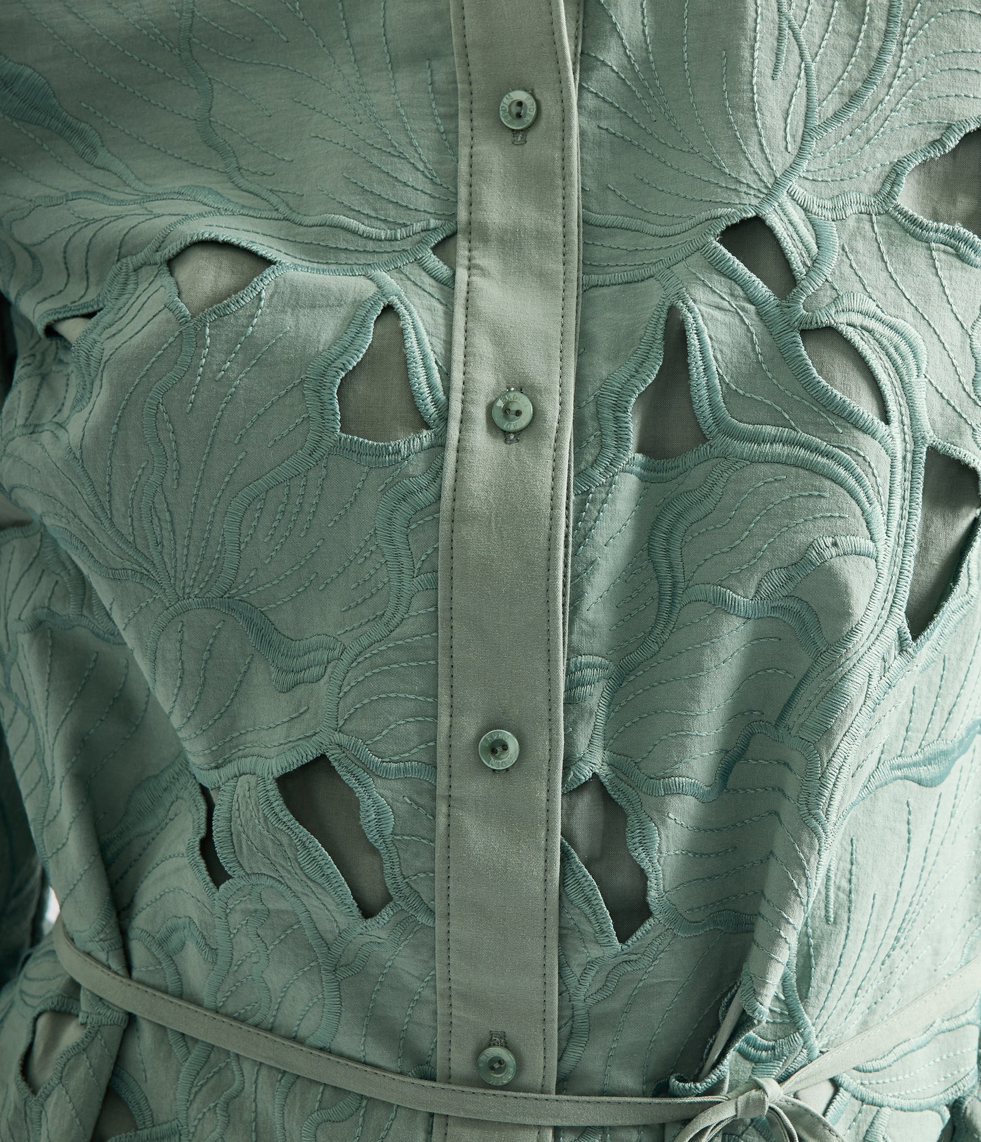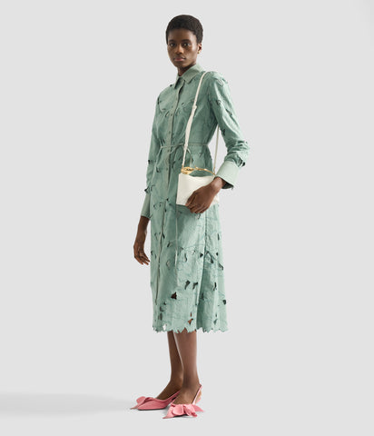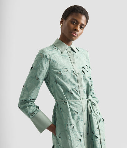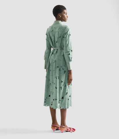 This shirt dress is made from eau de nil cotton cutwork. It features an embroidered floral design inspired by botanical illustrations by the German entomologist Maria Sibylla Merian.