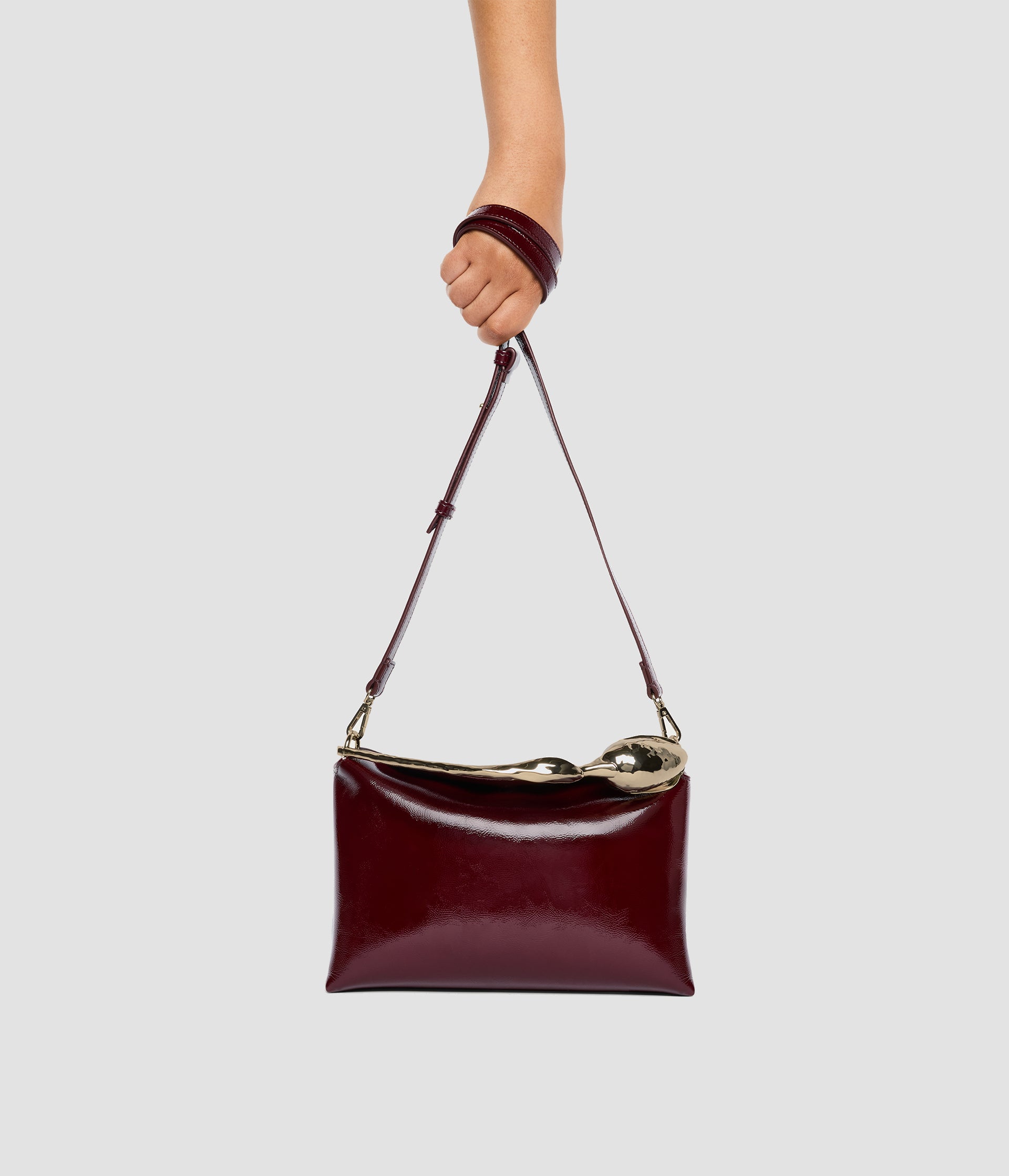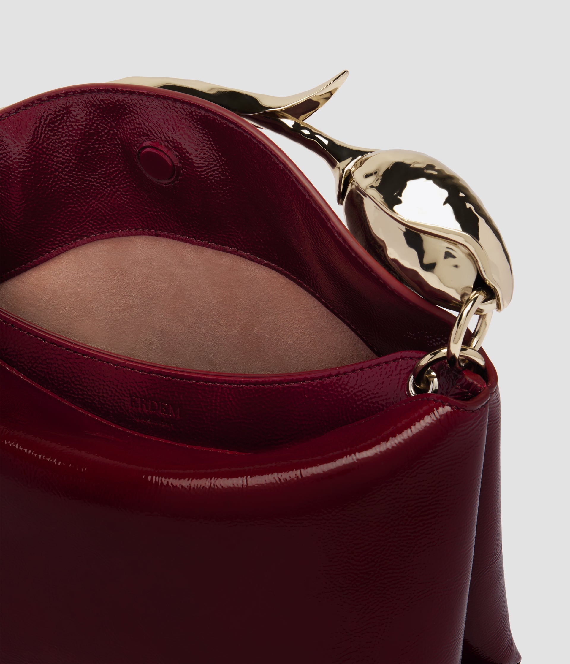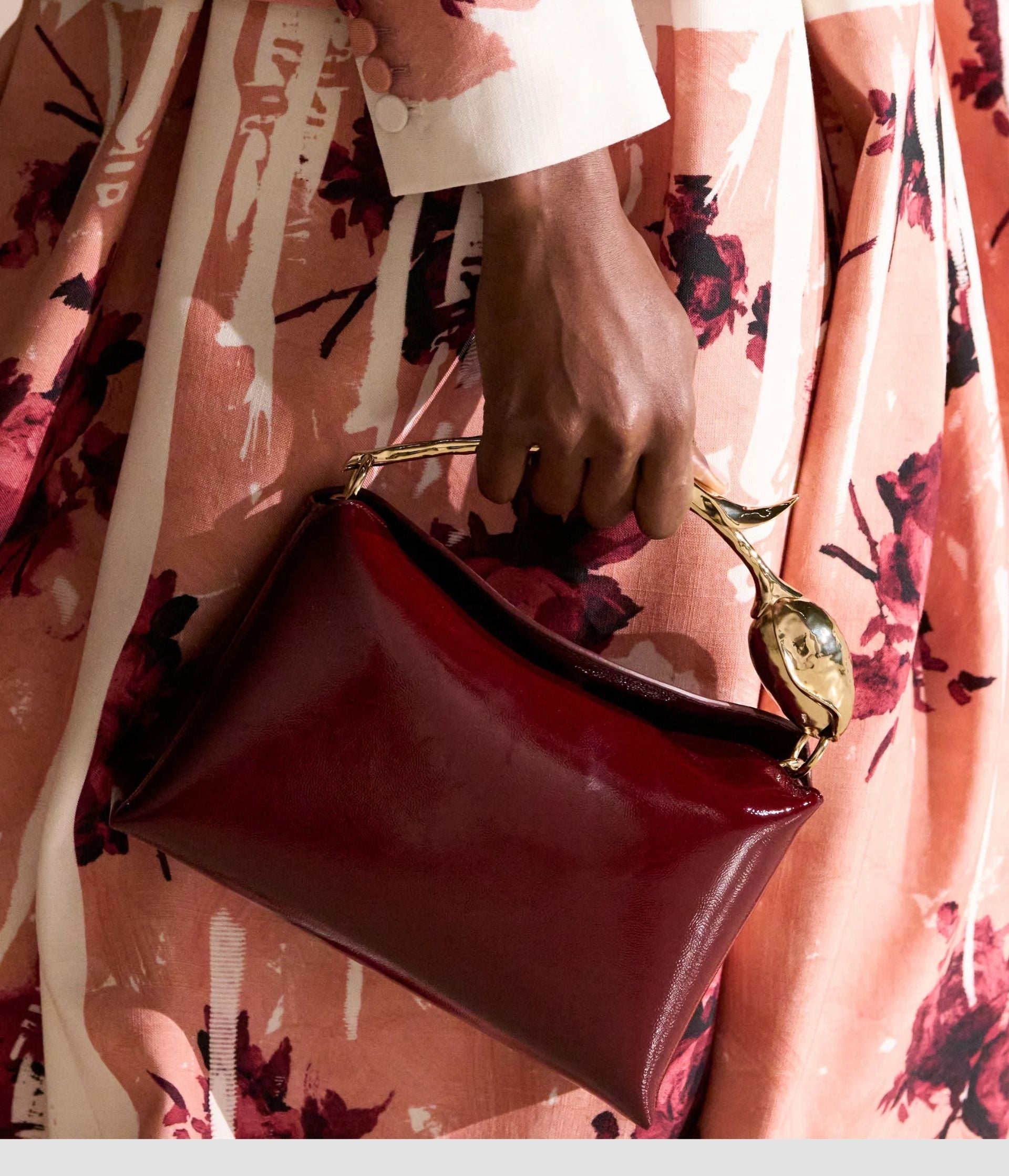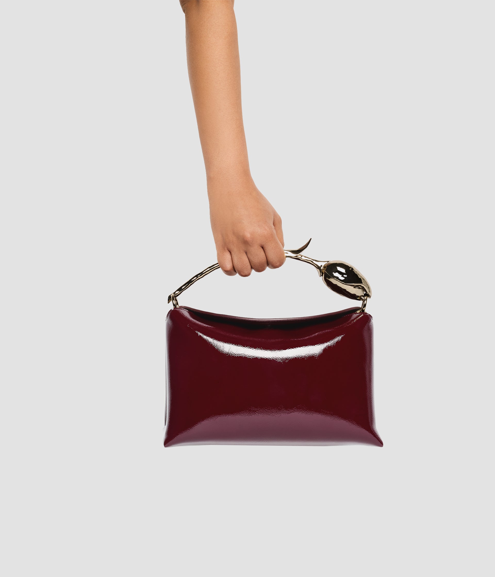 The Bloom Bag's gold-toned flower bud handle takes seven hours to produce using the lost wax casting method. It also features a petal-shaped magnetic top closure.