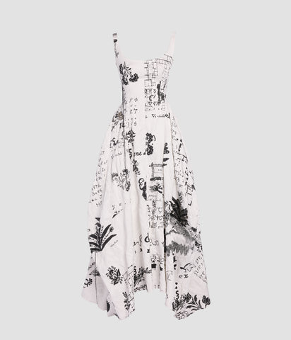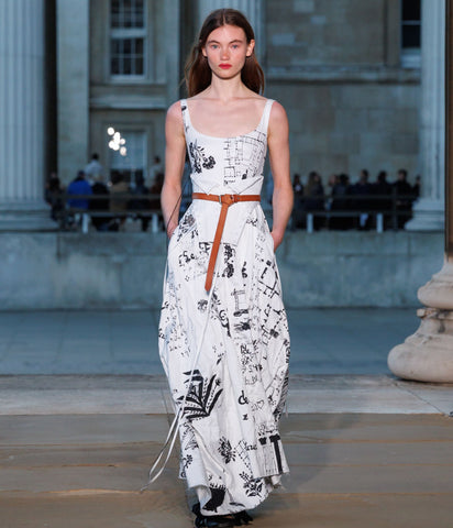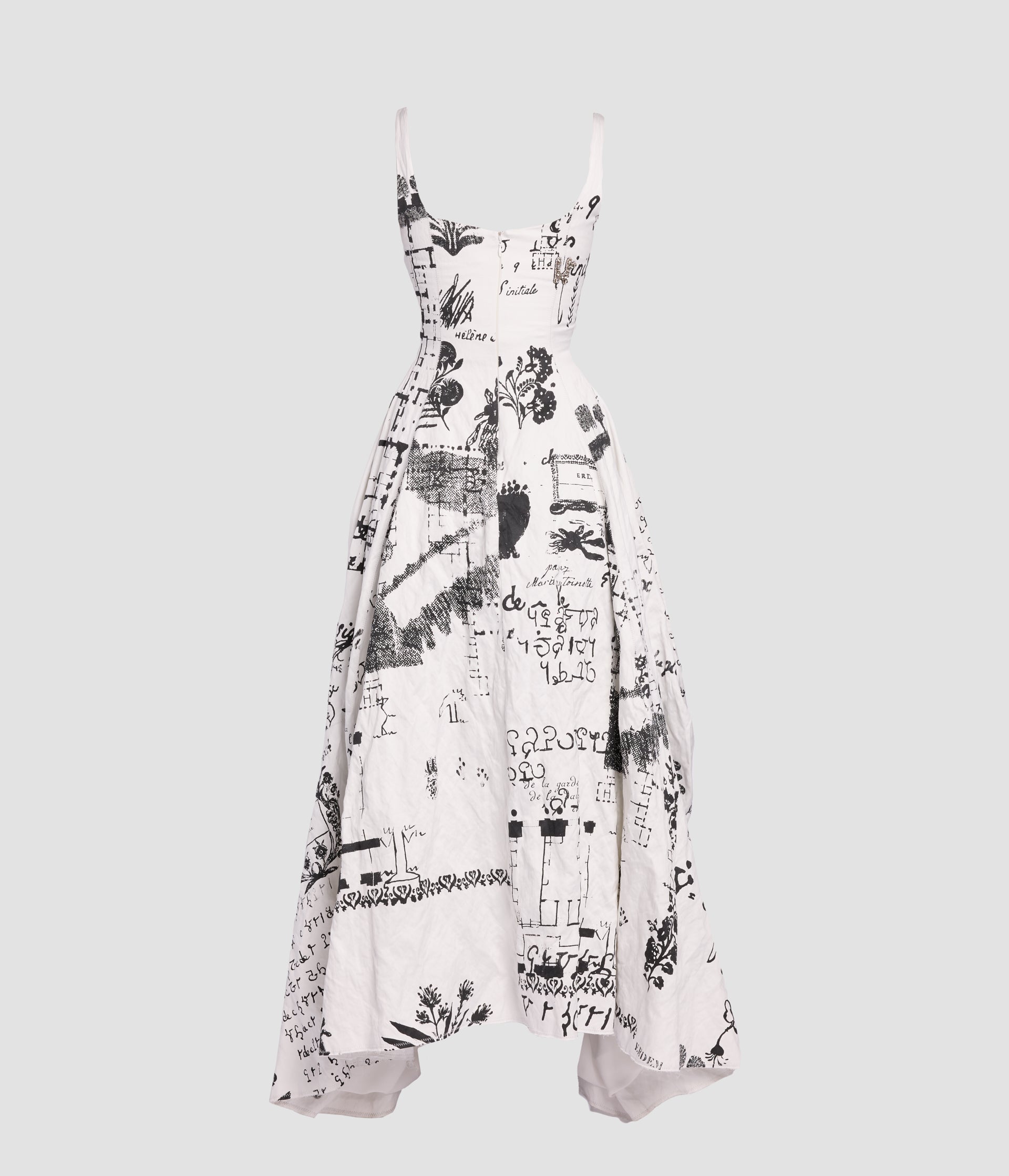 Look 15: Ivory metallised cotton pannier dress with graphic surrealist symbol print worn with corset belt.