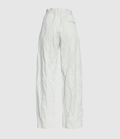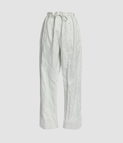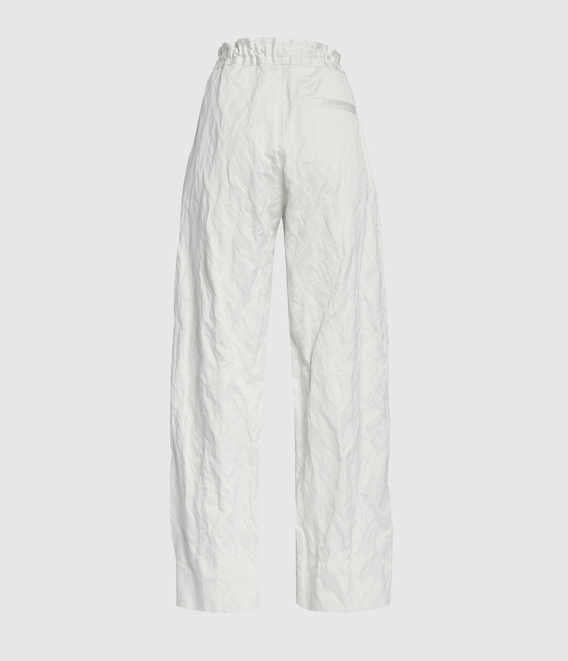 Look 14: Nightshirt and drawstring trousers in white metallised cotton layered with striped pannier corset belt.