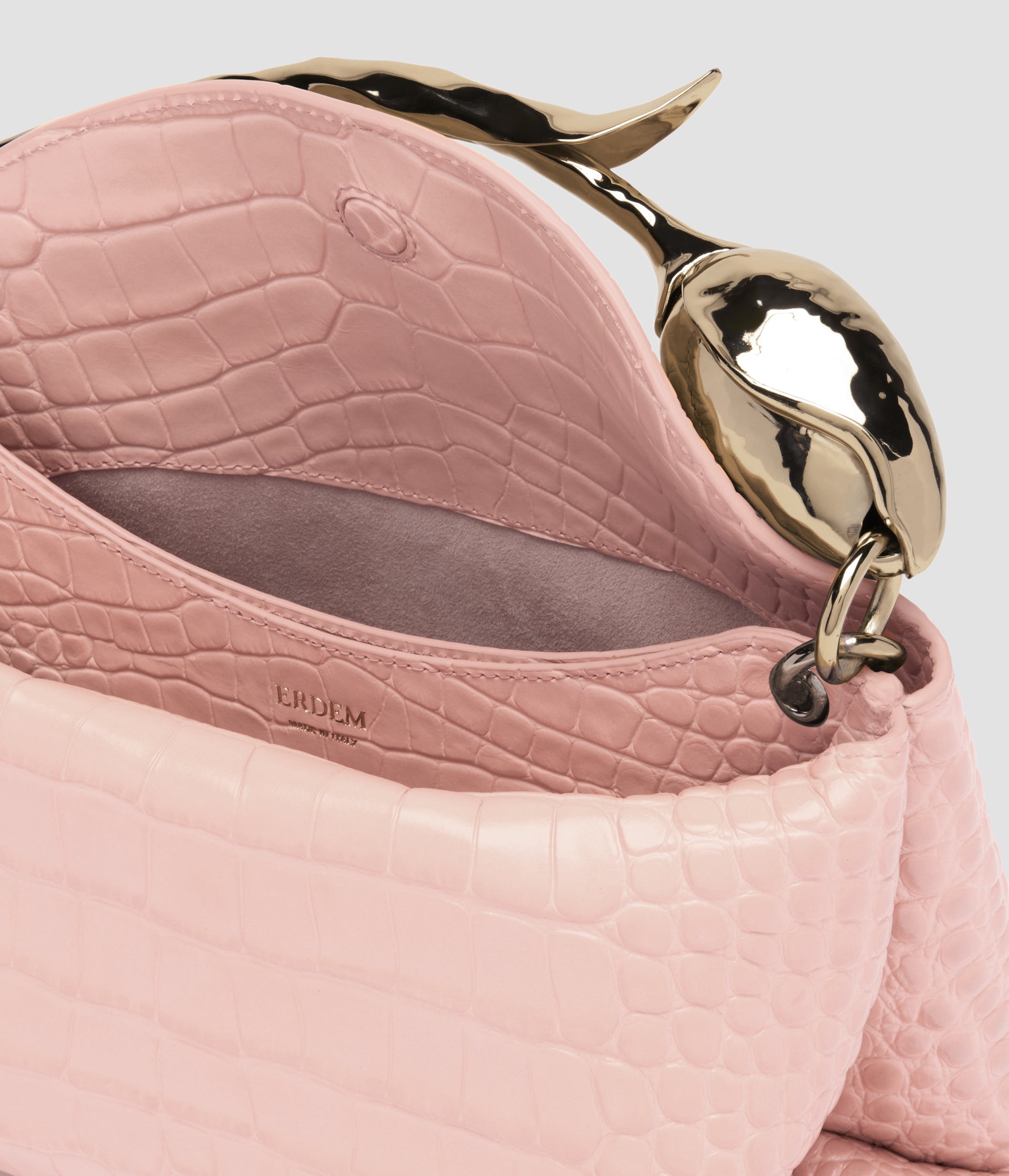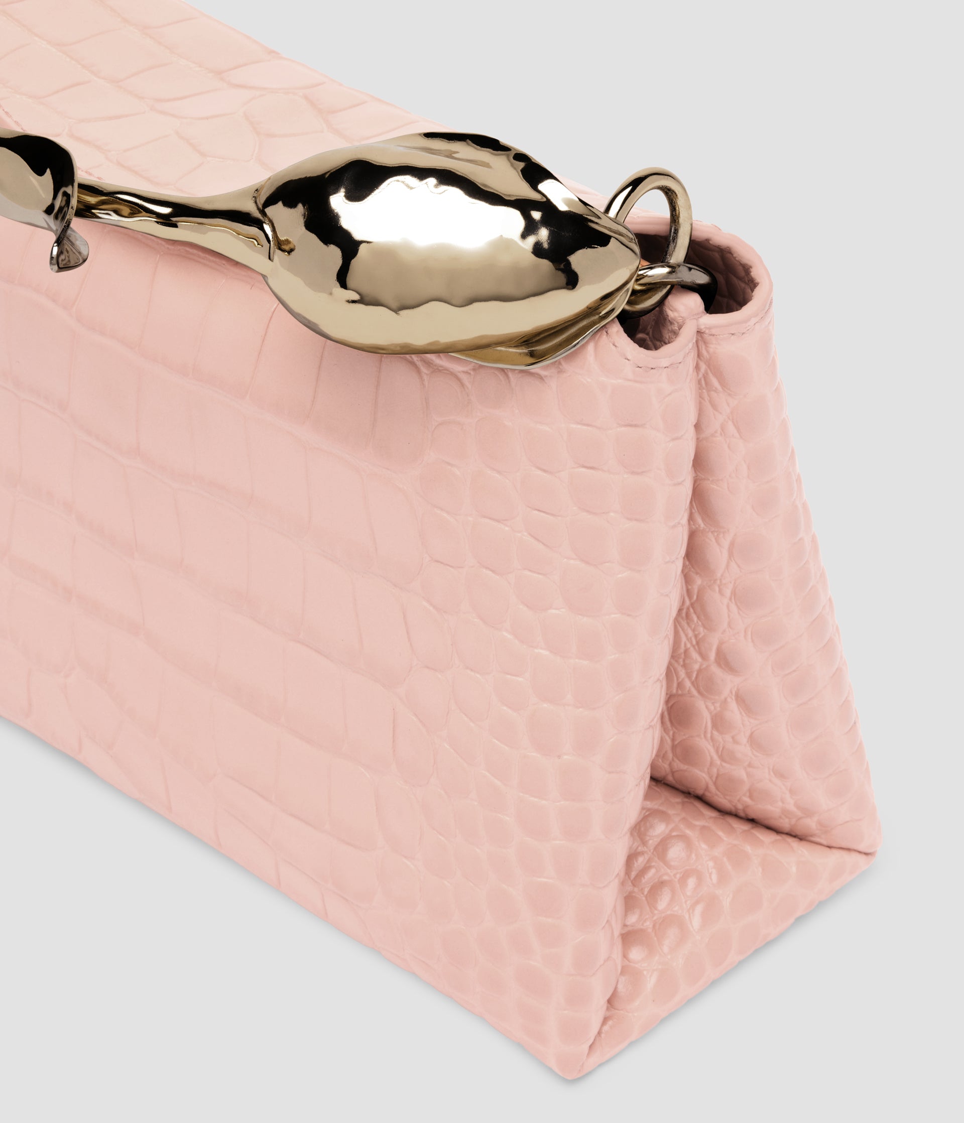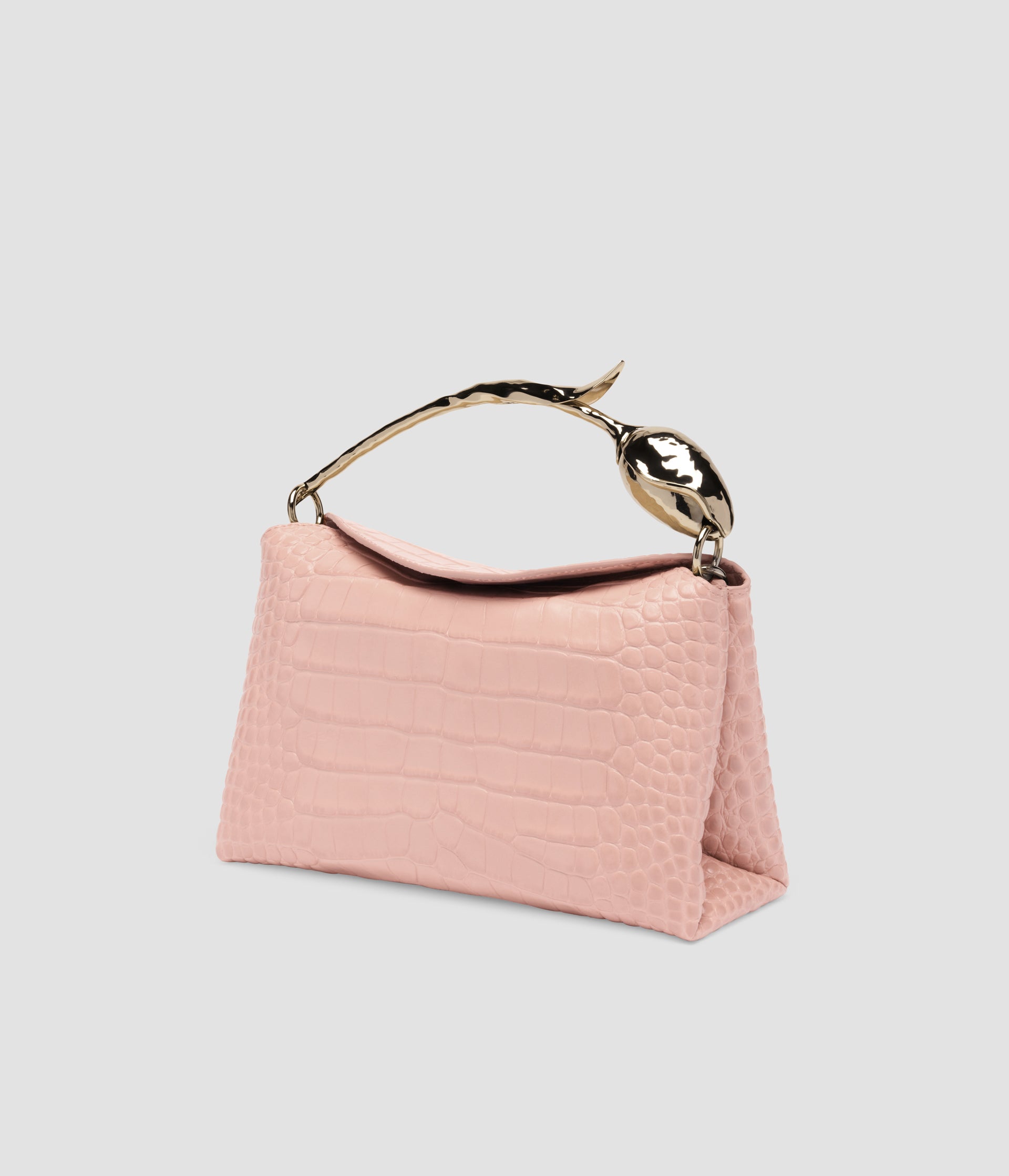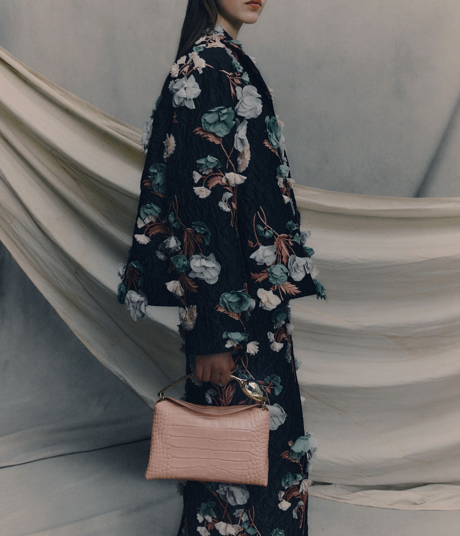 The Bloom Bag's gold-toned flower bud handle takes seven hours to produce using the lost wax casting method. It also features a petal-shaped magnetic top closure.