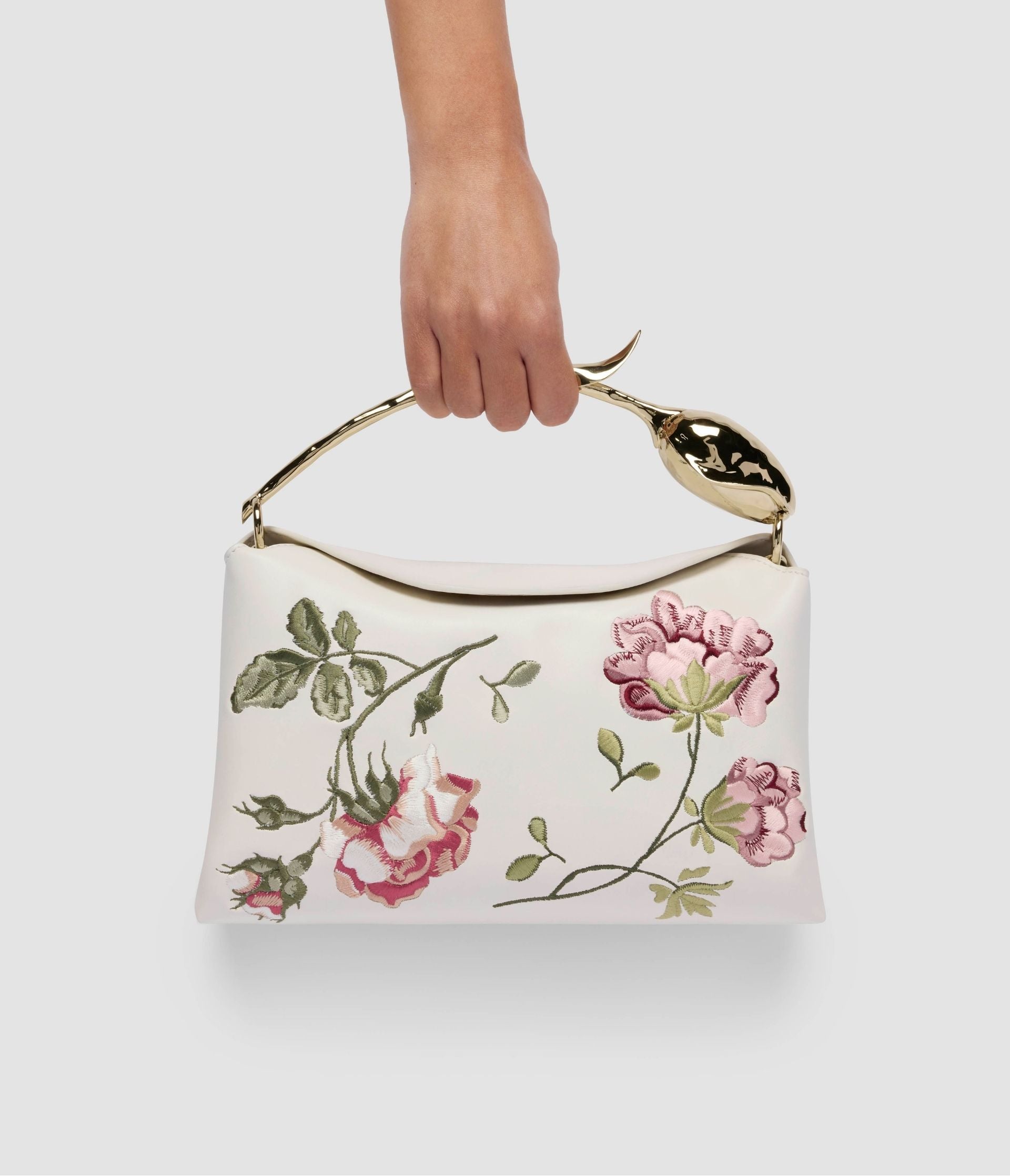 The Bloom Bag's gold-toned flower bud handle takes seven hours to produce using the lost wax casting method. It also features a petal-shaped magnetic top closure.