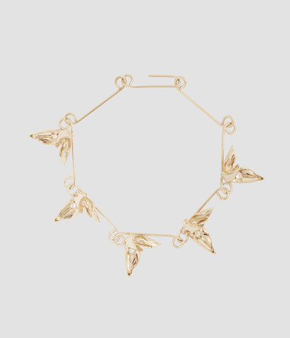 This light-gold structured necklace is decorated with large flowers, each one featuring crystal petals.