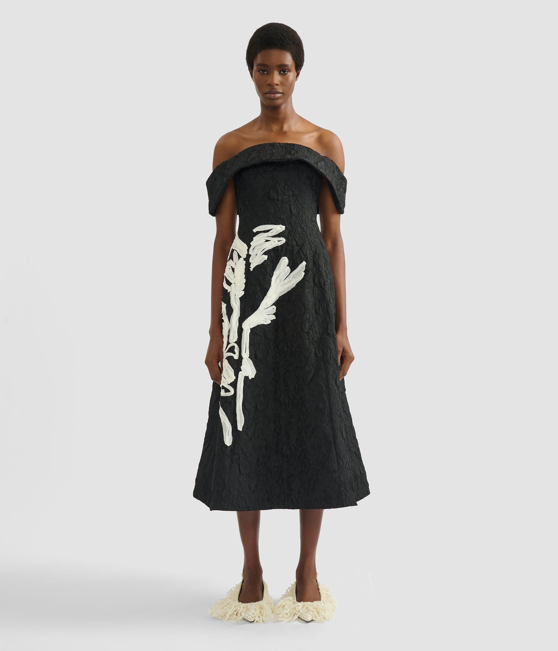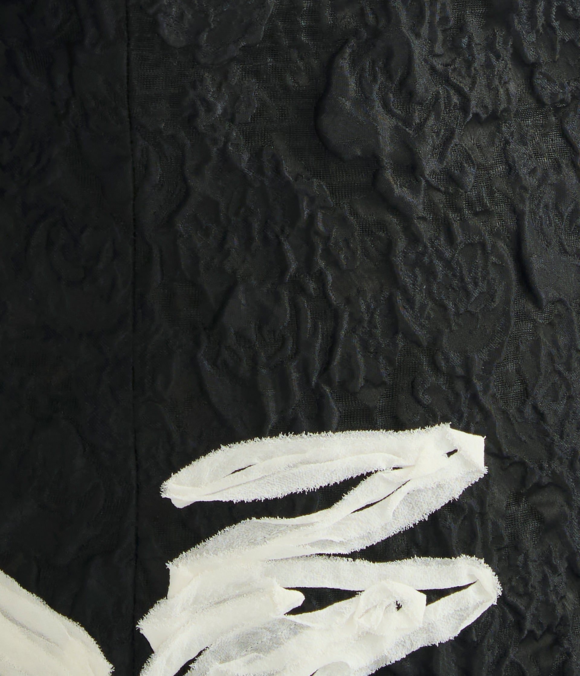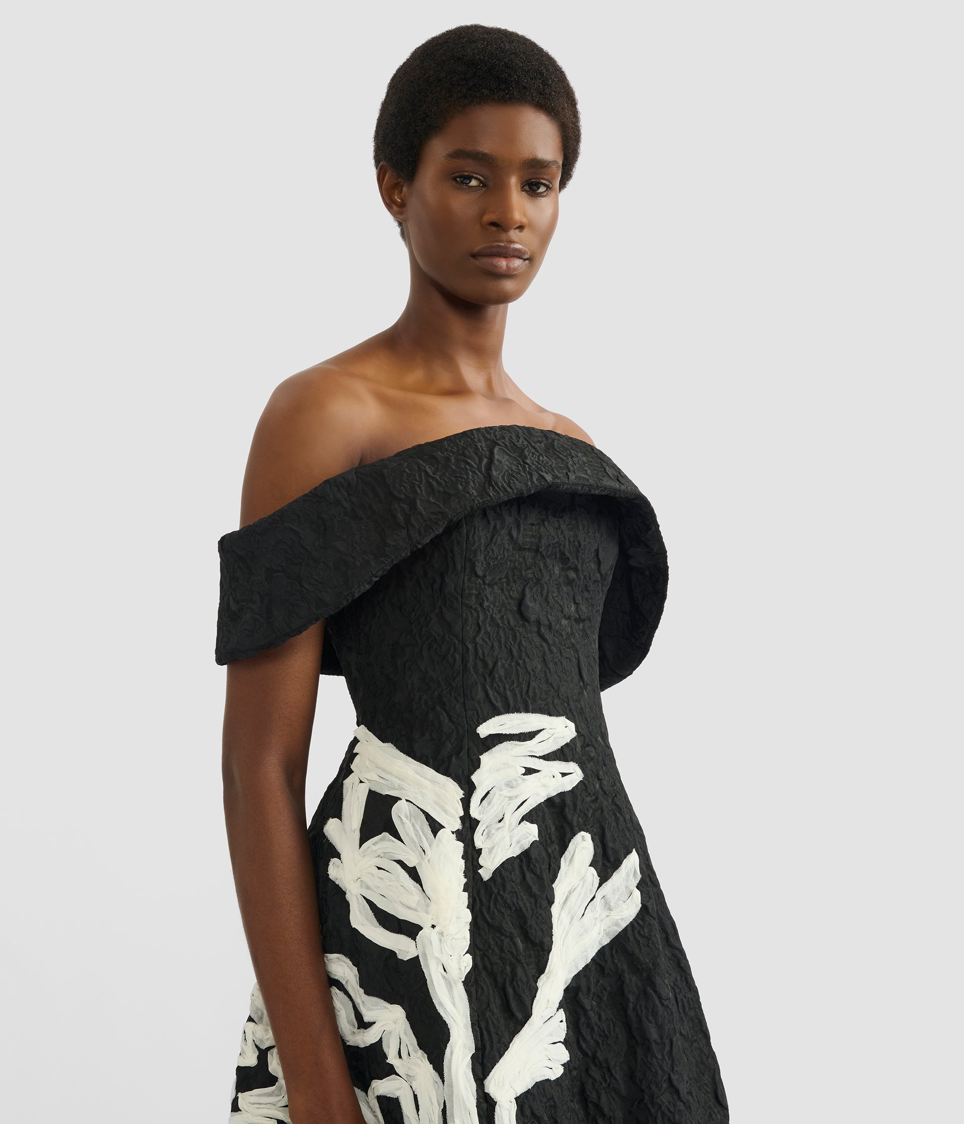 Italian cloque jacquard sets the foundation for sculptural silhouettes traced with floral georgette appliqués.