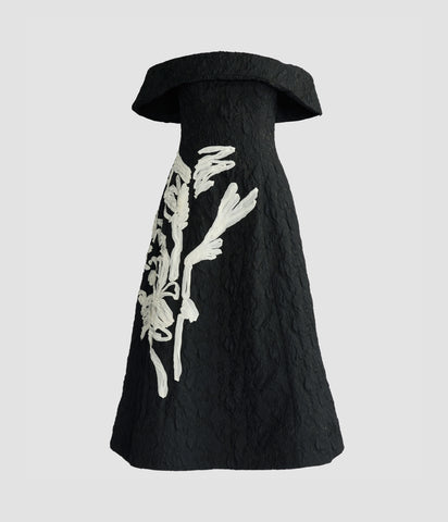 Crafted from dense black cloque jacquard, this strapless gown is decorated with an oversized white flower.
