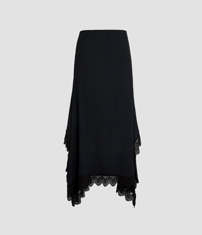 Draped from black satin cady, this skirt is detailed with guipure lace trims at the waterfall hem. The mood is evocative of 17th century Dutch fashion, one of the inspirations for Pre SS26.